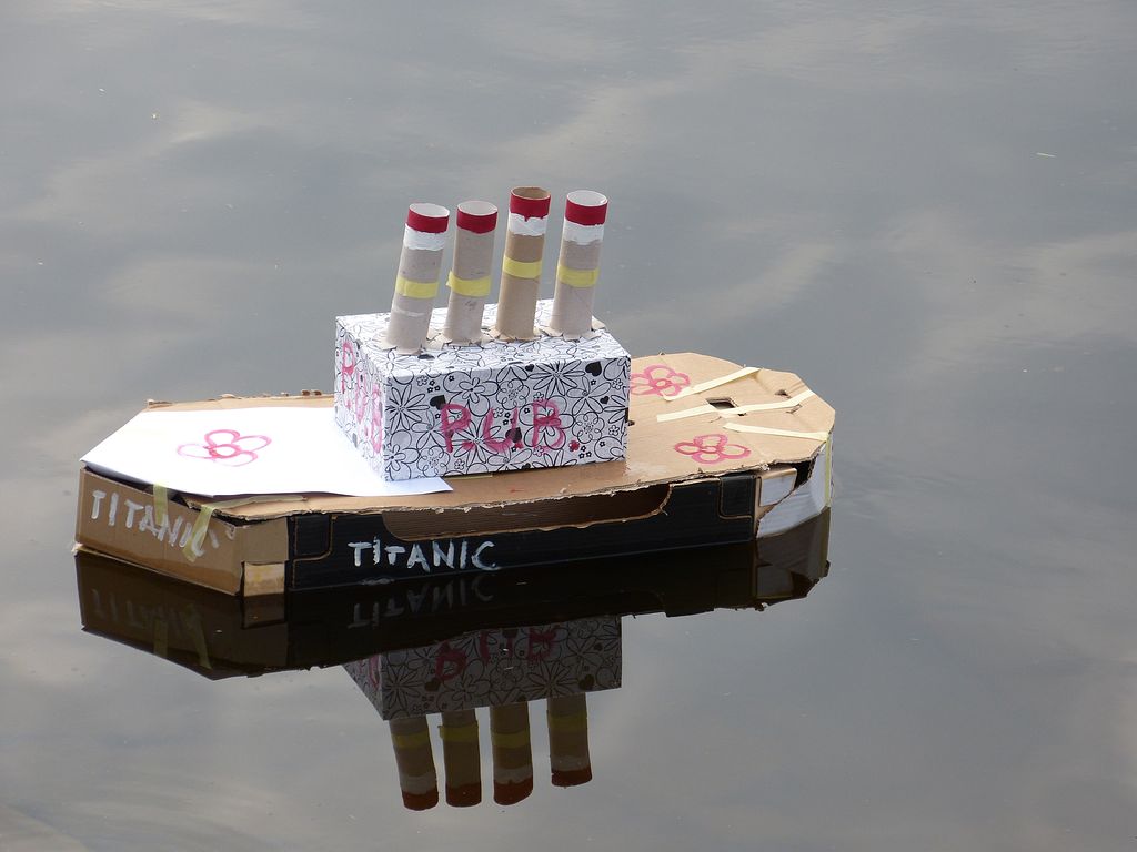 Pěkná recese :-) Akorát trochu nedomyšlené s tím potápěním, samotný karton opravdu plave poměrně dobře a je těžké ho dostat ke dnu. Chtělo by to zatížit kameny, starým železem apod. a počkat než voda dostatečně prosákne dovnitř. Případně pro urychlení nasimulovat efekt ledovce pomocí ostrého nástroje. Potom by to teprv byla zajímavá podívaná.