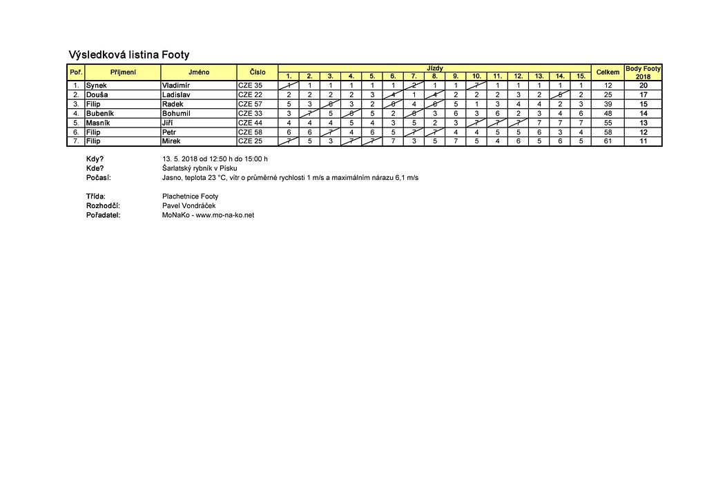 Soutěže plachetnic Footy 2018 - včetně výsledkových listin