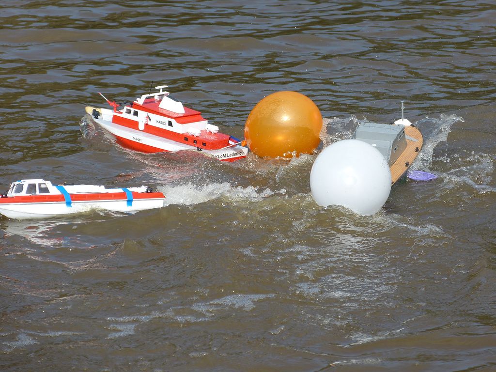 Konkurovat tomu mohlo pouze klání o Piráta roku 2012, ve kterém každý modelář vyjel do bojů se špendlíkem na přídi a balónkem na zádi s jasným cílem - přečkat se svým balónkem až do konce. Přestože je to lákadlo hlavně pro juniory, své modely se odhodlali ničit i senioři. Se svým Springerem jsem se rovněž zapojil, avšak bál jsem se, abych lehkotonážní plavidla soupeřů neposlal ke dnu, a tak jsem se bojům spíše vyhýbal. Po chvilce mi však upadl špendlík do vody, čímž bylo o rychlém konci mého plavidla rozhodnuto - Springer bez špendlíku cizí balónek nepropíchne![]()