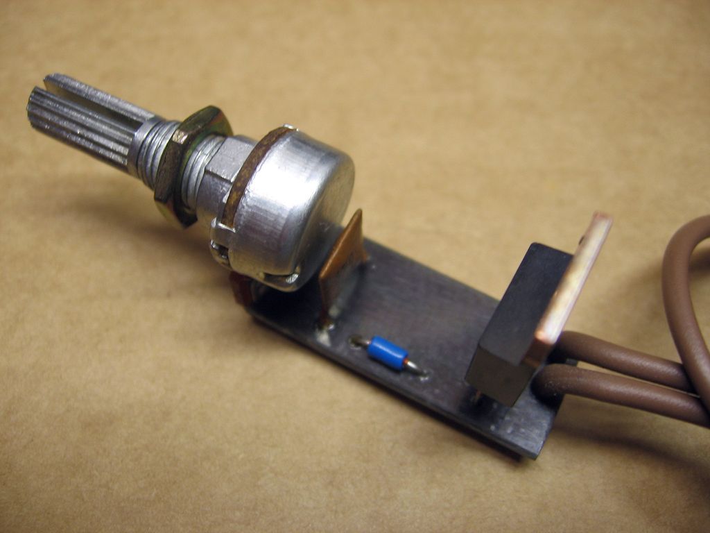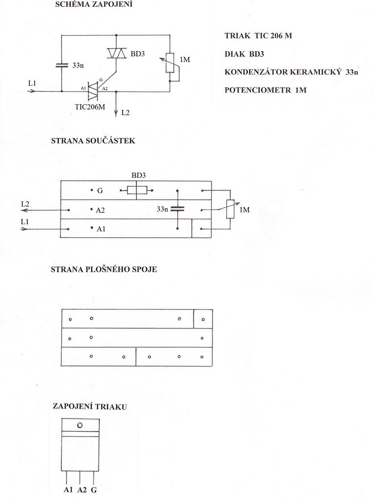 Brusku jsem rozebral, abych zjistil kolik je uvnitř místa. Chtěl jsem dovnitř umístit jednoduchý regulátor otáček. Místo bylo pouze v horní části krytu, ale pro umístění regulátoru stačilo. Regulátor se skládá z triaku TIC206M, diaku BD3, keramického kondenzátoru 33 nF a potenciometru 1 MΩ. Plošný spoj je vyroben z jednostranného kuprexitu a je pouze vyškrábán ocelovou rýsovací jehlou.