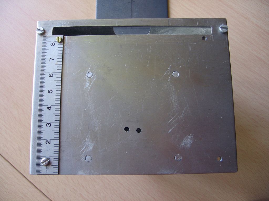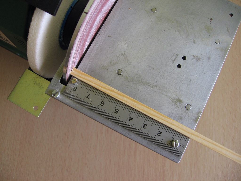 Stolek, který je vertikálně kolmý k brusnému kotouči, je pomocí dvou šroubů M3 opatřen dorazem z kusu ocelového měřítka, což je vylepšení, které jsem udělal až po otištění článku v RC revue. Pomocí měřítka mám možnost kontrolovat ubroušení materiálu. Na dorazu lze nastavit požadovaný úhel broušení. Já mohu nastavit úhel 90° nebo 45°. Po vyvrtání patřičných dírek je možno brousit i jiné úhly.