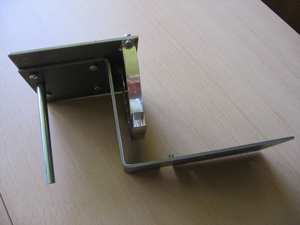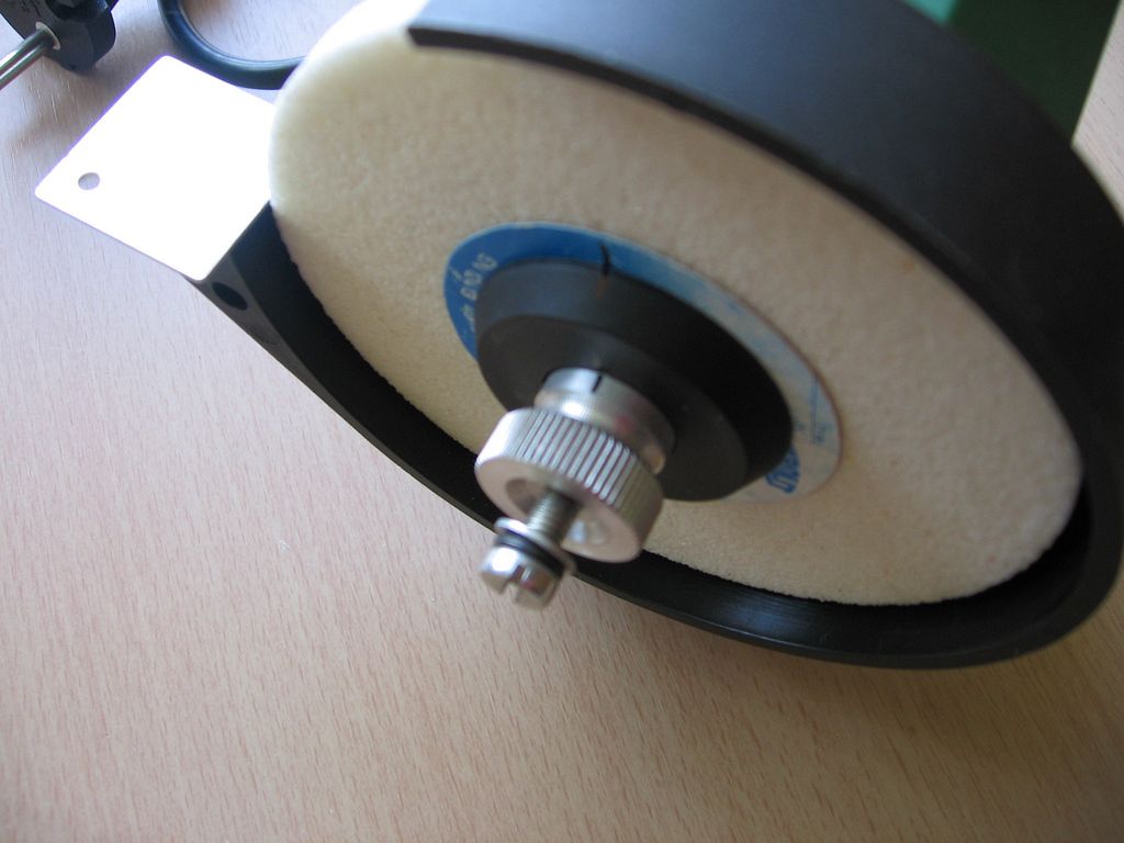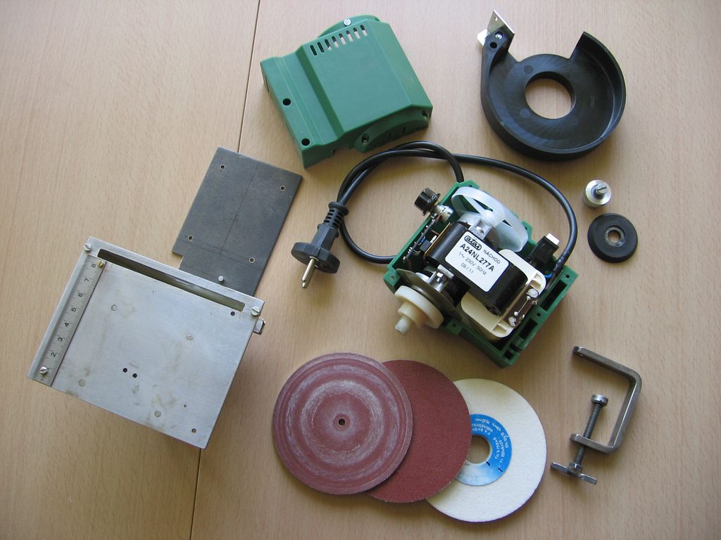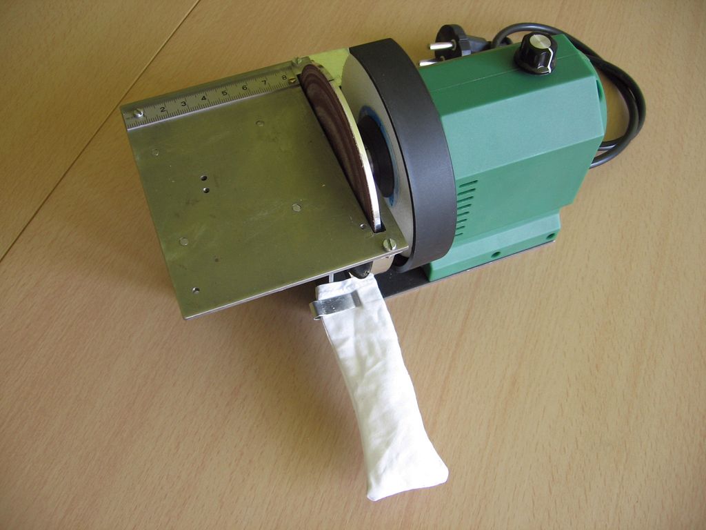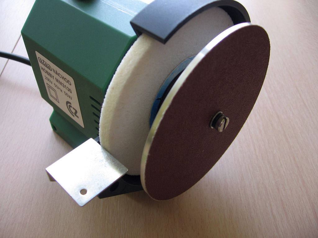 Z ocelového plechu o síle 2 mm jsem zhotovil držák ve tvaru písmene Z a přišrouboval k němu čtyřmi vruty brusku. Z druhé strany držáku je čtyřmi šrouby M4 přišroubován brusný stolek, do kterého jsem udělal otvor pro brusný kotouč. Kotouč je vyroben z 2mm duralového plechu o průměru 100 mm. Brusný papír jsem na něj přilepil Chemoprenem. Pro pohodlnější práci je vhodné si dopředu vyrobit kotoučů více, abychom se nezdržovali výměnou samotných brusných papírů různé zrnitosti. Sám jsem si vyrobil dva kotouče.