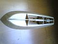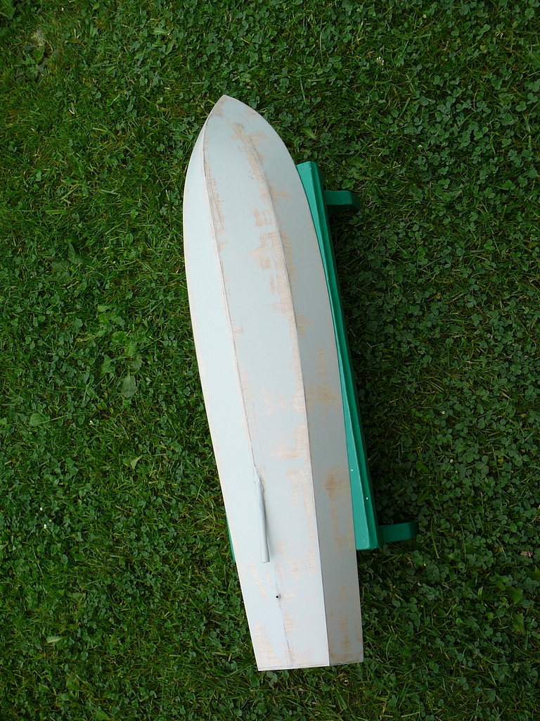 Po vybroušení a lehkém vytmelení jsem nechal trup odležet a v mezičase jsem si zajistil silný modelspan a lepící lak. Lak jsem naředil v poměru 1:1 s ředidlem a celý trup několikrát napustil. Mezi jednotlivými vrstvami laku jsem vždy lehce brousil. Pak jsem trup polepil modelspanem, celkem šesti díly: paluba, záďové zrcadlo, boky a dvě části dna, vše s dostatečným přesahem na zahnutí přes hrany. Potom opět broušení a několikeré lakování s broušením mezi vrstvami. Potom přišel na řadu základní nátěr a přebroušení (Obr. 05).