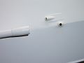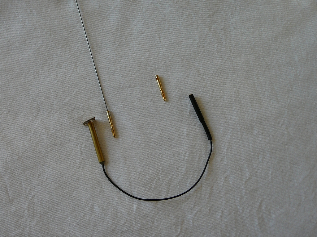 V mezičase jsem si připravil díly vstupu a výstupu chlazení motoru (Obr. 07), zdířku antény a anténu (Obr. 08). Vstup i výstup chladící vody jsou připájeny na kus mosazného plechu z kontaktů ploché baterie. Přesný důvod neznám, ale chtěl jsem mít něco kolem trubičky, co by umožnilo lépe a bezpečněji průchod trupem utěsnit. Měl jsem obavu, že spoj trubičky s obšívkou zalepený natupo nebude dostatečně pevný. Po zalepení do trupu jsem na trubičky nasadil silikonovou hadičku o průměru 4 mm. Délka je zvolena tak, aby umožňovala nasazení na chladící spirálu. Spoje jsou dostatečně těsné a drží bez jakéhokoliv dodatečného pojišťování. Vstupní trubička je uříznutá bez úkosu, ale je do dna vlepená pod hodně malým úhlem (doporučení od modelárny Vaňouch), takže voda do ní stupuje velmi snadno. Umístil jsem ji napravo mezi šroub a pouzdro kormidla (Obr. 09).