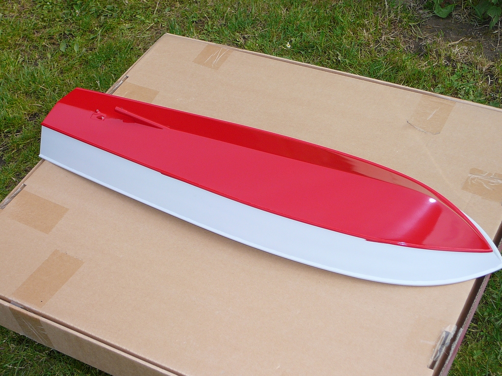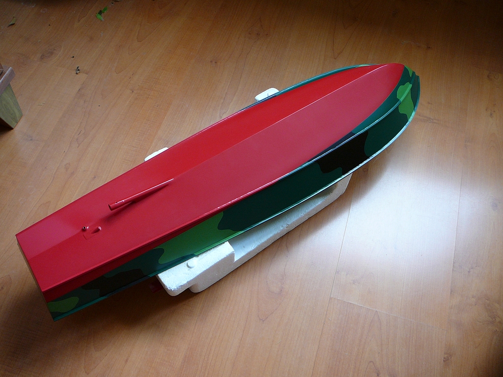 Po těchto operacích následovaly první jízdní zkoušky. Co kdyby to nejezdilo? To by nemělo cenu pokračovat ve stavbě. Na chalupě, za bezvětří jsem se vypravil k rybníku, vše zapojil, vyzkoušel, oblepil výplň otvoru na palubě lepicí páskou a položil trup na vodu. A ono to jezdilo! Měl jsem velikánskou radost, protože loďka měla zhruba takovou rychlost, jakou jsem si představoval. Svižný rozjezd, příď z vody. Jakákoliv rychlá, byť i malá výchylka kormidla v plné rychlosti způsobila velice ostrý obrat. Po chvíli jsem se vrátil ke břehu a zkontroloval vybavení. Motor (přestože má vodní chlazení), regulátor i baterky byly dost teplé. Počítal jsem s nějakým zkoušením a měl jsem připravené další velikosti šroubů, abych mohl trochu experimentovat. Vyměnil jsem tedy šroub. Místo původního 40 mm jsem nasadil šroub o průměru 30 mm. Pohon se hřál výrazně méně, ale rychlost také poklesla. Následoval šroub o průměru 35 mm. S ním jezdila lodička zhruba očekávanou rychlostí a pohonná soustava se hřála méně než se šroubem 40 mm. V pohodě jsem na obou udržel ruku. Paráda a spokojenost. Došel jsem k závěru, že pokračovat ve stavbě má smysl.
