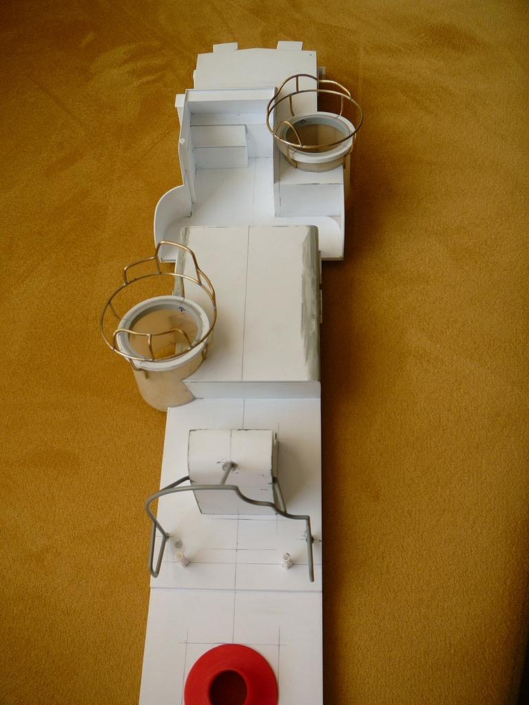 Průběžně, po celou dobu stavby trupu a nástavby, jsem stavěl doplňky. Víceméně bez systému, na co byla chuť a co se dalo. Většinou výzbroj a výstroj nástavby a paluby, podle času. Tyto drobnosti se totiž dají dělat i po malých krůčcích v kuchyni na stole, což je moje pracoviště/dílna. Nic většího tam dělat nelze, protože musím co chvíli vše balit, abych uvolnil místo pro „důležitější činnosti“. Jakékoliv špinavější činnosti musí buďto na balkon nebo na chalupu. Přišel tak na řadu stožárek a omezovací oblouk 40nbsp;mm kanónu (Obr. 21), omezovací konstrukce kulometných věží (Obr. 22), záchranné vybavení (Obr. 23), tlumiče výfuků (Obr. 24) - bohužel, makro vidí i to, co moje oko už nevnímá -, a různé antény (Obr. 25). Antény a omezovače jsou z mosazného drátu různých průměrů, zohýbané do požadovaného tvaru a spájené cínem. Tlumiče jsou vlastně dvě trubičky PSH (profily Evergreen) slepené k sobě, ovinuté páskem tenkého (0,5nbsp;mm) PSH. Po zhotovení úkosu jsou konce „zavíčkované“ kouskem PSH a víčka vybroušená do tvaru. Ostatní doplňky jsou postupně nalepené.