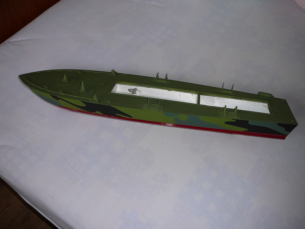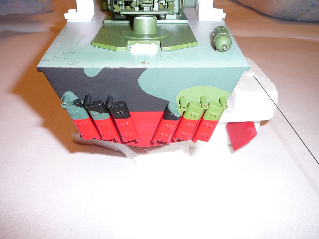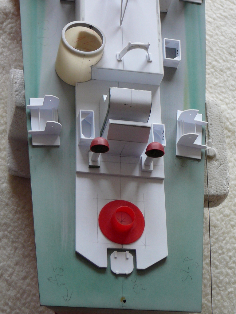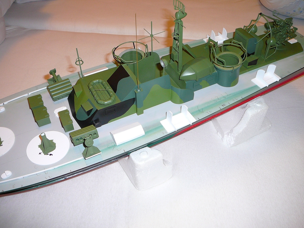 Po dokončení části zbraňových systémů jsem se rozhodl natřít nástavbu. Po důkladném zvážení, jestli zvládnu uspokojivě zamaskovat a sprejem nastříkat její relativně komplikovaný tvar, jsem došel k závěru, že radši budu „štětcovat“. Ale čím? Stříkat si barvu ze spreje do kelímku a natírat ji štětcem jsem s ohledem na vlastnosti barev radši zavrhnul. Nezbývalo, než sáhnou jinam. Dobrou osobní zkušenost mám s barvami Humbrol, které použil i autor plánku a tak bylo rozhodnuto. Sice to představovalo nutnost přestříkat celý trup znovu, ale nakonec jsem se s tím smířil. Dalším podpůrným argumentem bylo, že jsem v mezičase sehnal přesné kamuflážní schéma. Nástavbu, záď s tlumiči a všechnu výstroj jsem natřel štětcem barvami Humbrol (Obr. 56 a Obr. 57). Když byla nástavba hotová, přestříkal jsem ji při nejbližší příležitosti polomatným lakem, aby se barvy „neosahaly“. V létě na chalupě jsem celý trup nastříkal znovu (samozřejmě jsem předtím vše přebrousil), tentokrát správnými odstíny barev a ve správném kamuflážním schématu (Obr. 58, Obr. 59 a Obr. 60). Zároveň jsem zkorigoval polohu vodorysky, která mi v původním provedení trochu „ujela“. Po několikadenním schnutí jsem vše nastříkal polomatným lakem pro zlepšení odolnosti nátěru.