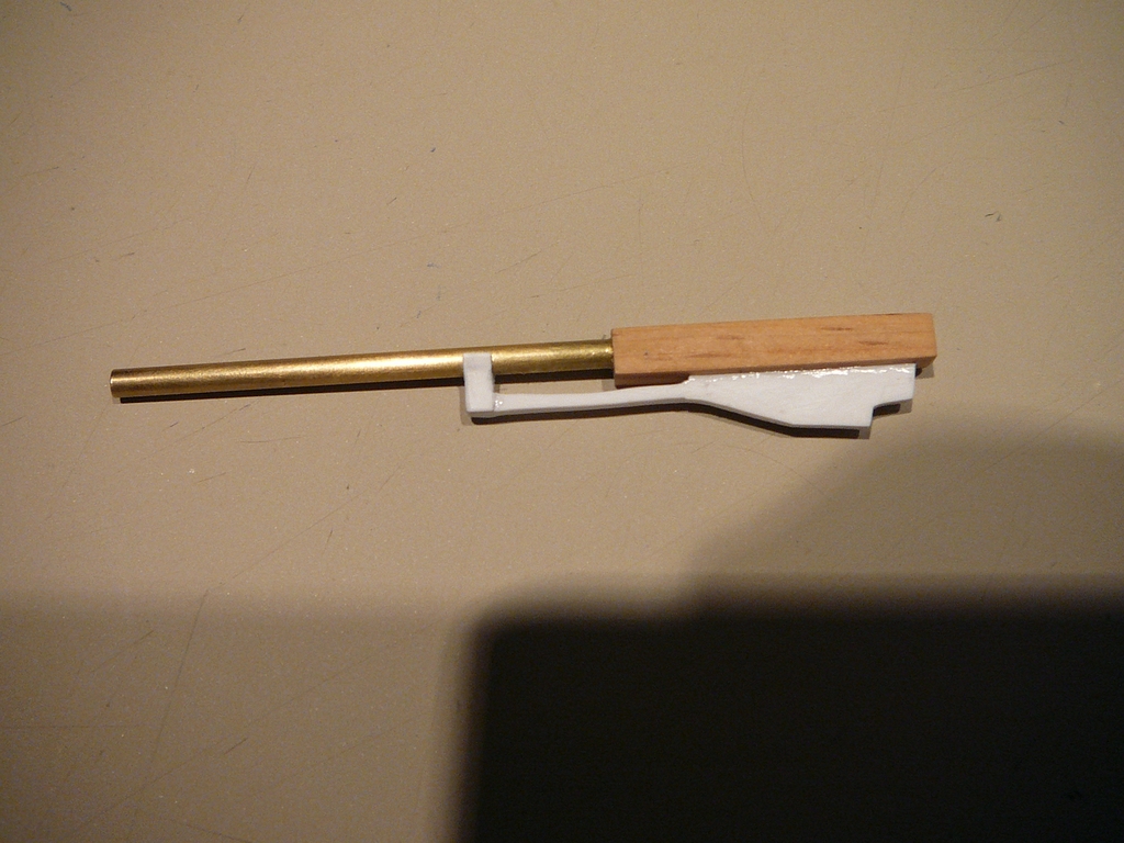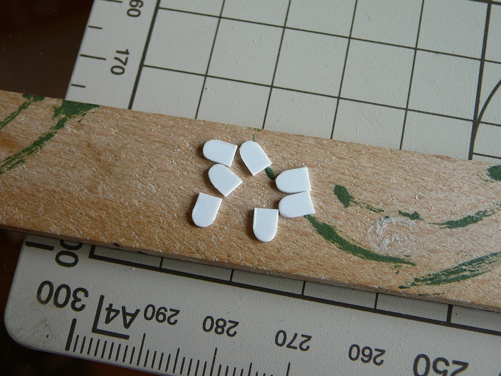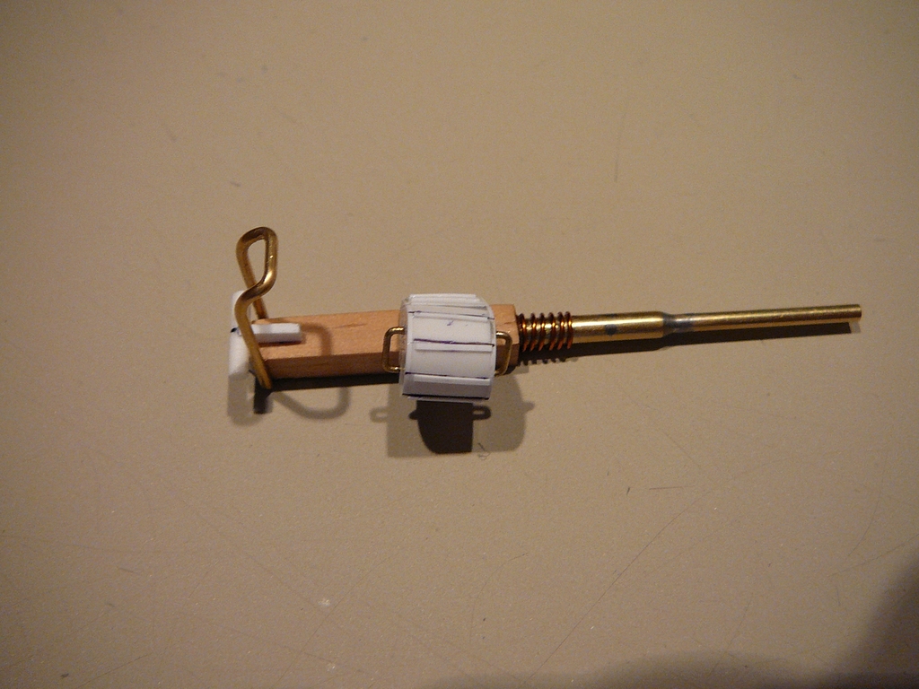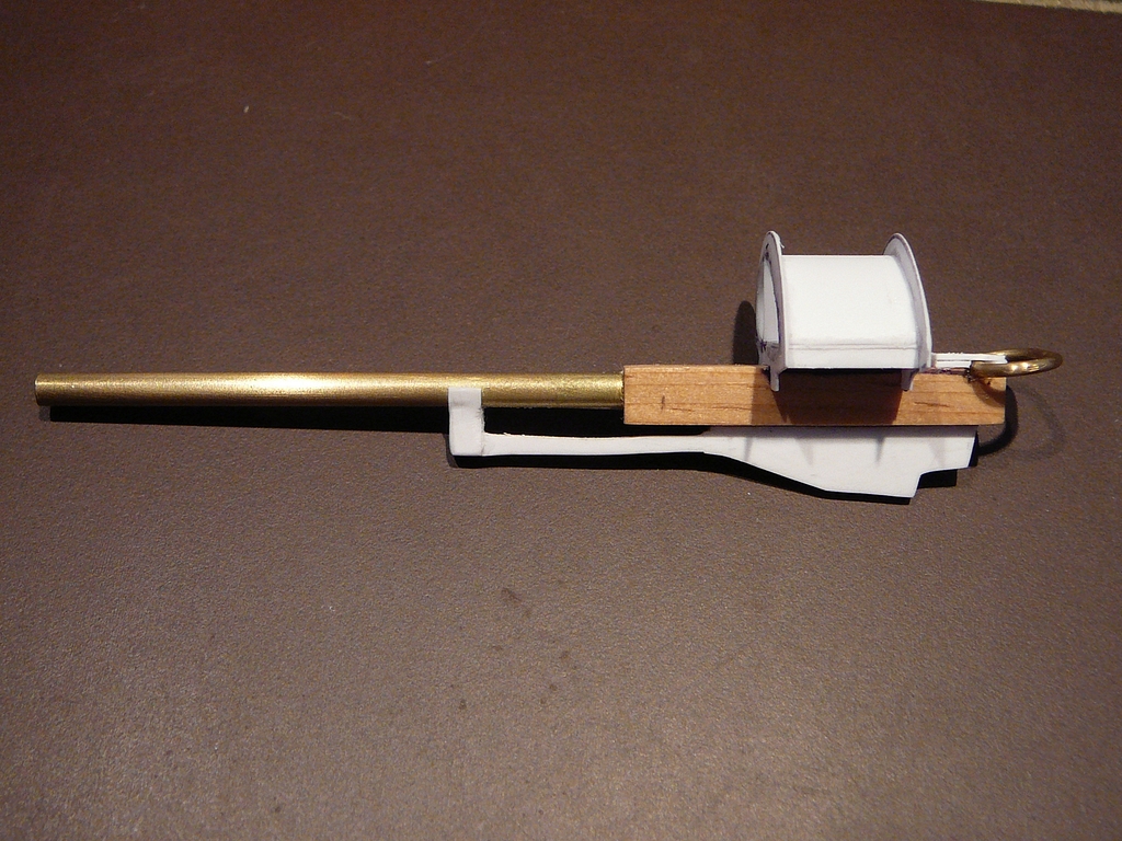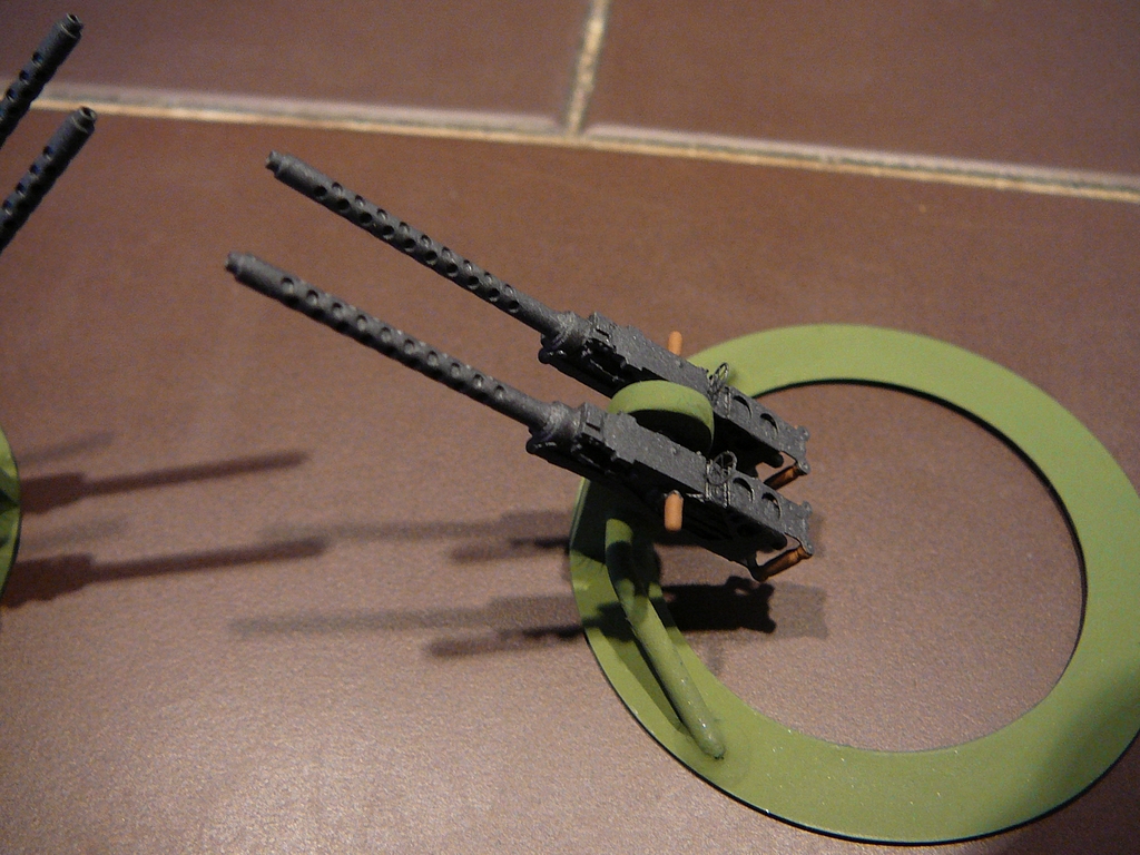 Dále přišly na řadu podstavce příďových kanónů, raketomety, bedny na munici, držáky torpéd, poklopy a ventilátory (Obr. 26 a Obr. 27). V průběhu času jsem postupně vyráběl další doplňky. Kanón 20 mm (Obr. 28, Obr. 29, Obr. 30, Obr. 31, Obr. 32 a Obr. 33), 37nbsp;mm kanón (Obr. 34, Obr. 35, Obr. 36, Obr. 37, Obr. 38, Obr. 39, Obr. 40 a Obr. 41), 40nbsp;mm Bofors (Obr. 42 anbsp;Obr. 43) z pirátských odlitků, kulomety Browning (Obr. 44) ze stavebnice AIRES a torpéda (Obr. 45, Obr. 46, Obr. 47, Obr. 48, Obr. 49, Obr. 50, Obr. 51, Obr. 52, Obr. 53, Obr. 54 a Obr. 55). Kromě stavebnic dvou zbraní je vše výroba „samo-domo“, nebo – abychom byli světoví - „scratch-build“. Materiál je tedy různý: dřevěné lišty, mosazné trubičky, měděný drát, profily a desky PSH.