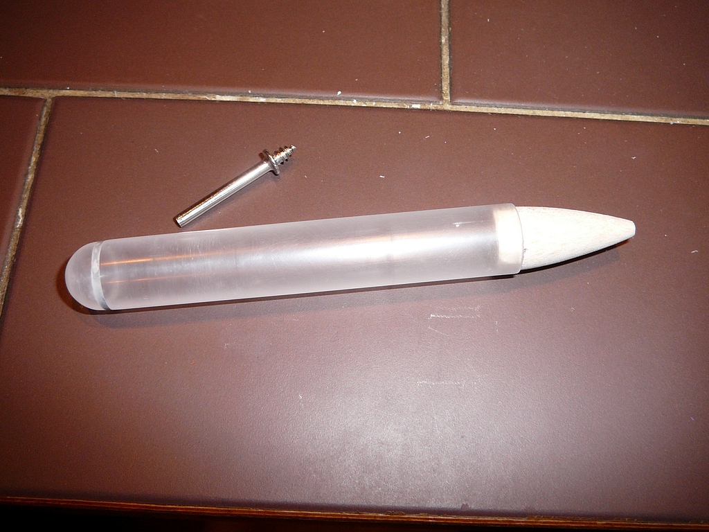 Za samostatnou zmínku stojí asi torpéda. Moji kluci totiž jednou přivlekli od kamaráda zkumavku. To by nebylo nic mimořádného, zkumavek jsem za svůj život pár viděl, ale tahle byla plastová. Po krátkém vyjednávání mi umožnili vyzkoušet „slepitelnost“. a hned napoprvé jsem se strefil: lepidlo na plastikové modely fungovalo skvěle a kousek PSH na zkumavce perfektně držel. Zabrouzdal jsem na internetu a zjistil, že zkumavky z PSH jsou běžně k dostání a navíc ve vyhovujících rozměrech (průměr 16nbsp;mm). Dokonce i délka vyhovovala mým potřebám. Při cestě k zubaři jsem proto navštívil nedalekou prodejnu s laboratorními potřebami (hned vedle prodejny PAN-AIR) a potřebné 4 kusy zakoupil. Při ceně cca 3,- Kč za kus to snad ani nešlo jinak. S koncovými kónusy torpéd už byla situace horší, protože nepatřím mezi šťastné majitele soustruhu. Nakonec vše vcelku uspokojivě vyřešil kousek balsy a upínací trn na filcové leštící kotoučky upnutý do vrtačky (Obr. 46).