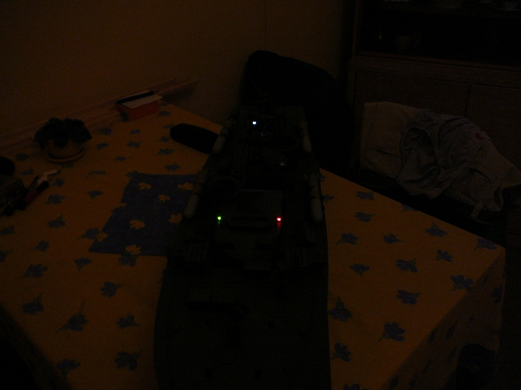 Nadešel čas dalších drobností, jako například vybavení kormidelny (Obr. 61) a dokonce jsem se rozhodl pro doplnění funkčních pozičních světel (Obr. 62, Obr. 63, Obr. 64 a Obr. 75) (omlouvám se, poslední obrázek nic moc). Ta jsem zhotovil z LED o průměru 3nbsp;mm, které jsem zalepil do trubičky PSH odvrtané tak, aby do ní šla LED těsně zasunout. Před vlepením LED jsem v trubičce vyřízl a vypiloval otvor, který by měl sloužit jako vymezovač sektoru svícení. Horní konec LED jsem zabrousil naplocho a trubičku jsem odshora zatmelil. Rozvody jsem vedl vnitřkem nástavby, jen od bílého stožárového světla jsou kablíky vedeny po stožárku. Použil jsem jednotlivé žíly servo kabelů. Napájení beru z BEC přijímače.