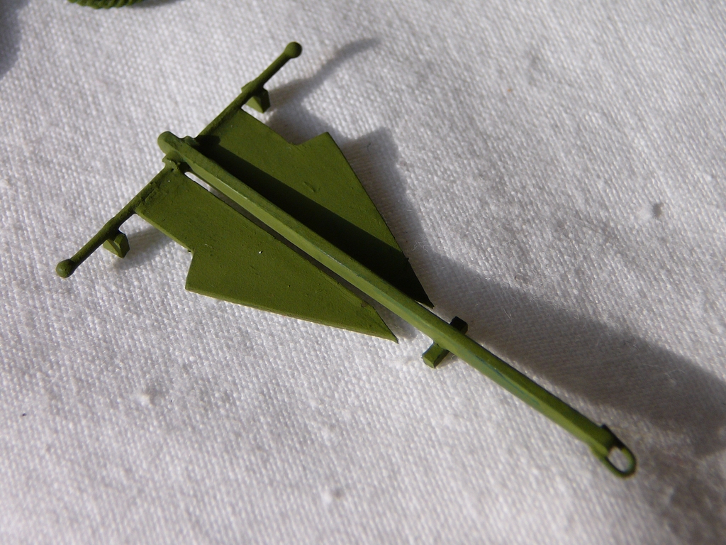 Po definitivním umístění palubních doplňků a torpéd zbývalo ještě napevno osadit příďové kanóny a raketomety. Ještě jsem se rozhodl doplnit záchranné kruhy, příďový průvlak a kotvu (Obr. 65, Obr. 66, Obr. 67 a Obr. 68).