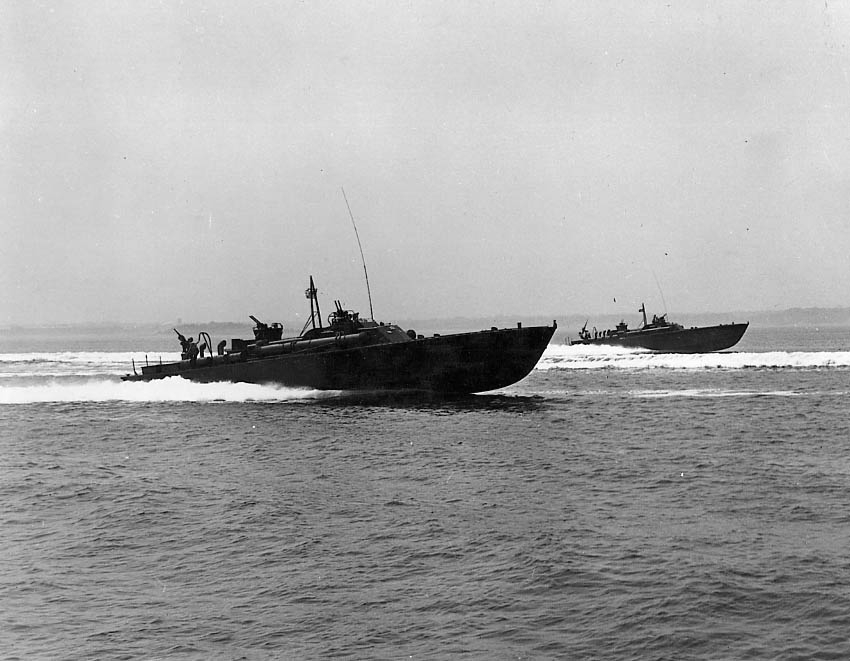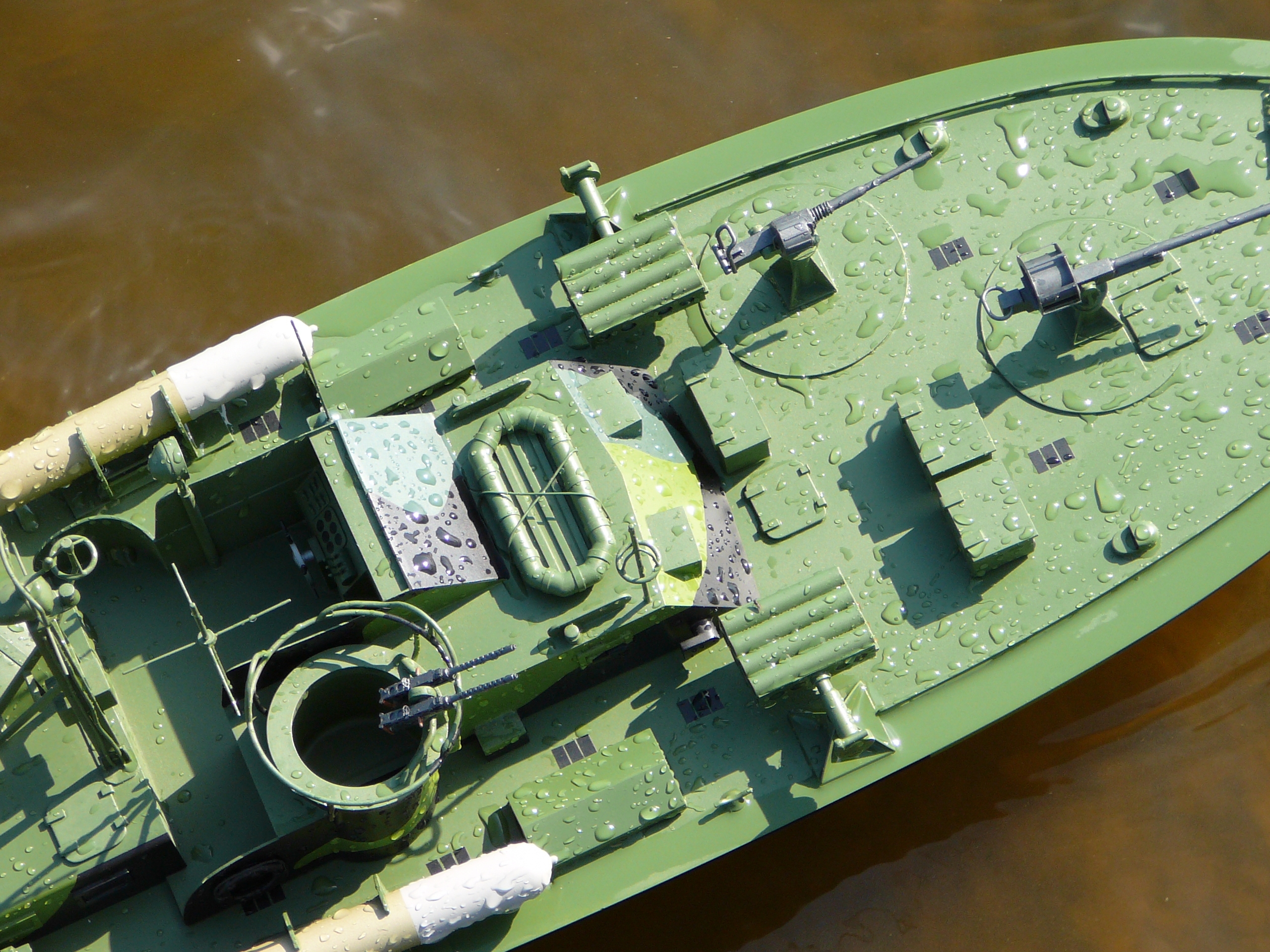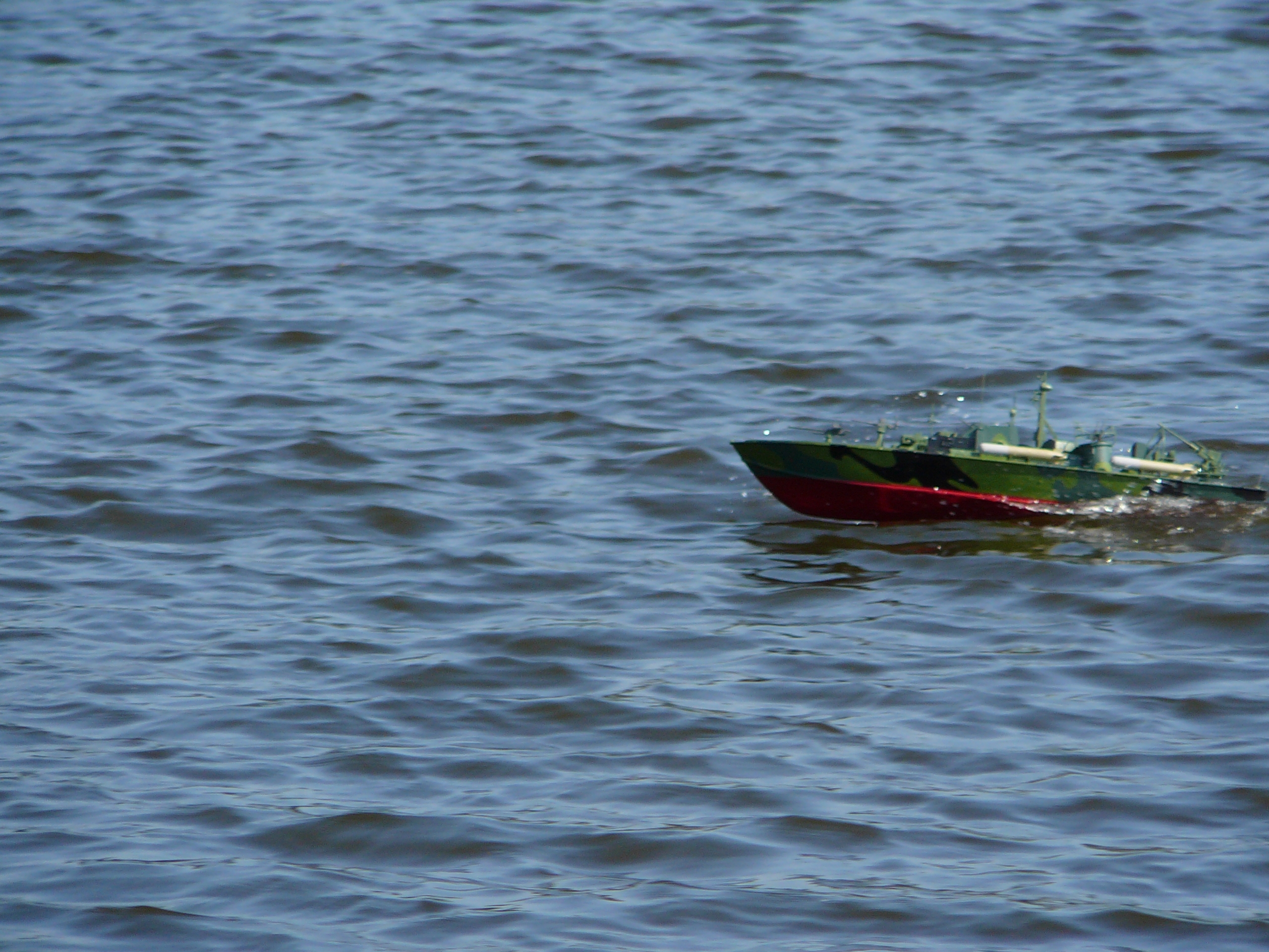 Po přípravě na jízdu jsem loď položil na hladinu a první dojem byl dobrý! I přes to, že díky změnám ve "strojovně" vyšla hmotnost o cca 400 gramů vyšší vůči originálu, loď perfektně seděla na vodorysce, bez náklonu, zkrátka paráda (Obr. 70). Ještě jednou jsem si ověřil, že kormidlo funguje a postupně jsem začal přidávat plyn. PT se rozjelo po zrcadlově klidné hladině rybníka. Nejdříve jsem vyzkoušel zatáčení při pomalé jízdě. Reakce na kormidlo byly dost živé, lodička velmi svižně měnila směr jízdy. Potom jsem zvyšoval rychlost až na maximální. Dojem z jízdy na plný plyn byl velmi realistický (Obr. 71). Dokonce i syn, který mi sekundoval se Sharkem, prohlásil (sám od sebe, aniž bych se ptal), že ta jeho loďka sice jede rychleji, ale ta moje že vypadá hodně opravdově. Samozřejmě, že se mi hruď nadmula pýchou a radostí. „Umělecký dojem“ byl skutečně dobrý, přímo oku lahodící. Dokonce jsem na chvilku zauvažoval o doplnění figurek námořníků. Příď nad hladinou, zhruba od poloviny délky trupu odstřikovala vodní tříšť. Když jsem si prošel fotografie skutečných PT-Boats (Obr. 72), bylo to hodně blízké skutečné předloze.