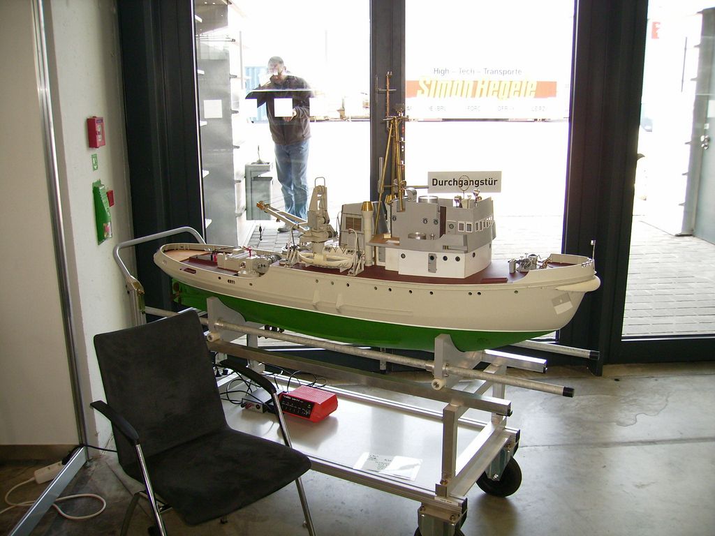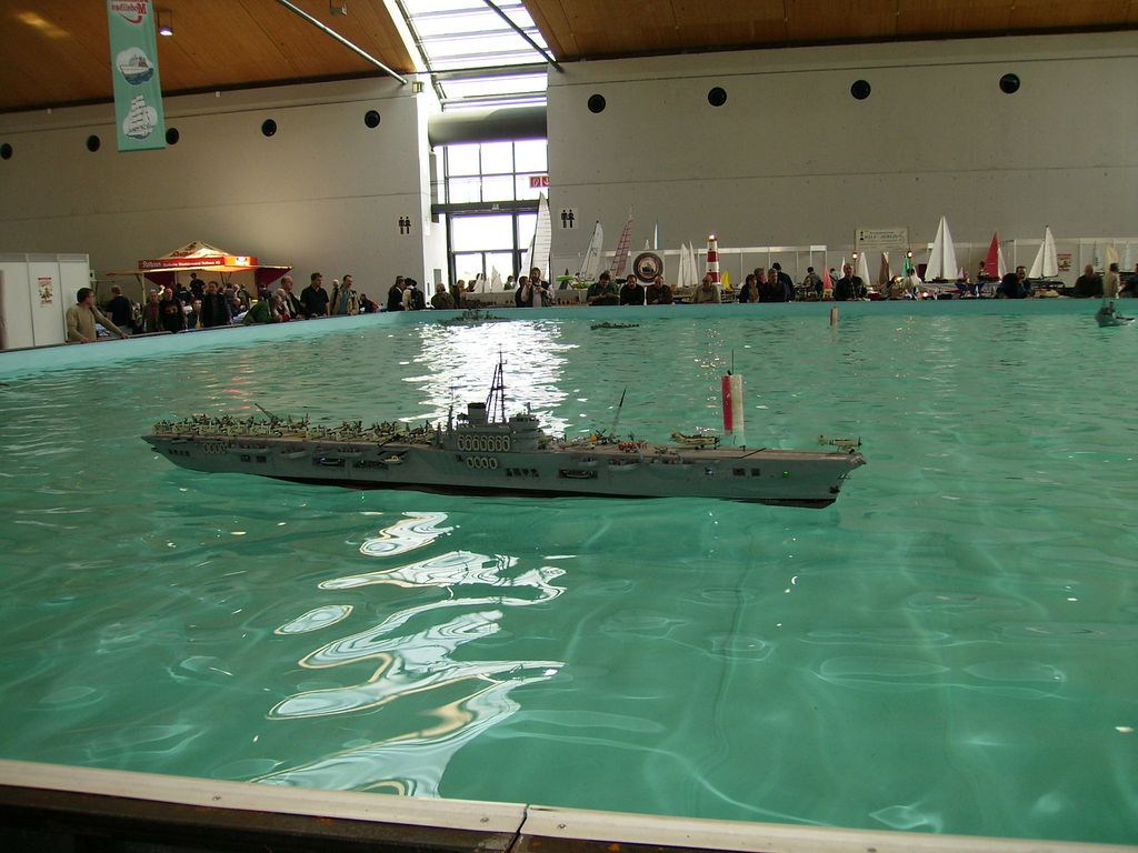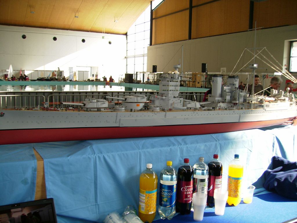 Kolem bazénu bylo asi 8 německých lodně-modelářských klubů, nafotil jsem si jejich „Badge“ (zrovna mě nenapadá jiné slovo). Jedna parta byli Angličani, ale jejich lodě byly podivně vybaveny šrouby a hřídeli, protože místo vedle sebe byly šikmo nad sebou a bez opěr. Zdá se, že tohle je nijak nebralo, i když lodě byly jinak docela hezké. Podívejte se na obrázcích. Tohle je parta, kterou jsem vídal už i v Sinsheimu. Asi mají s kamarády v Německu freundschaft a jezdí k nim vystavovat.