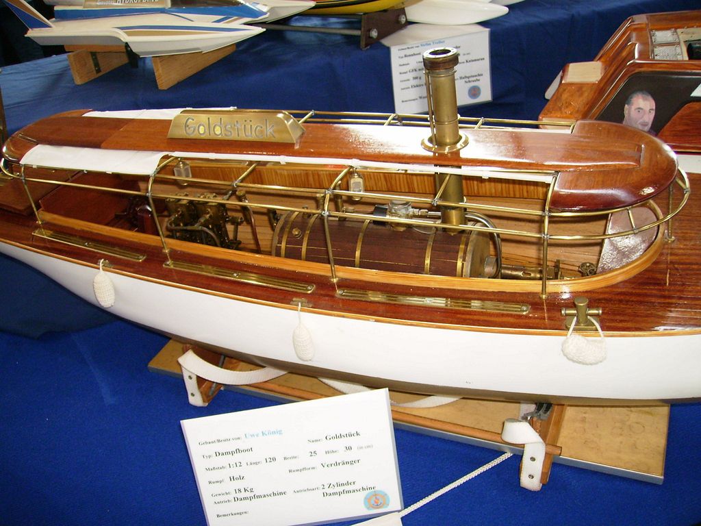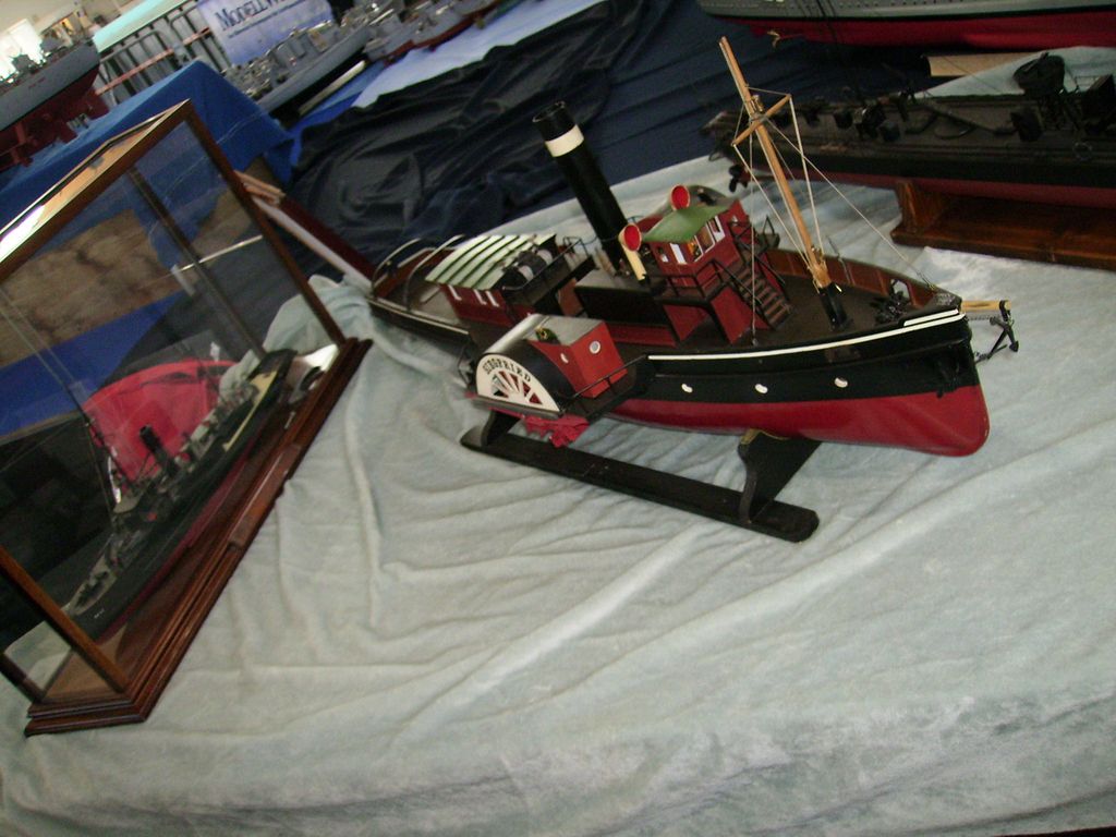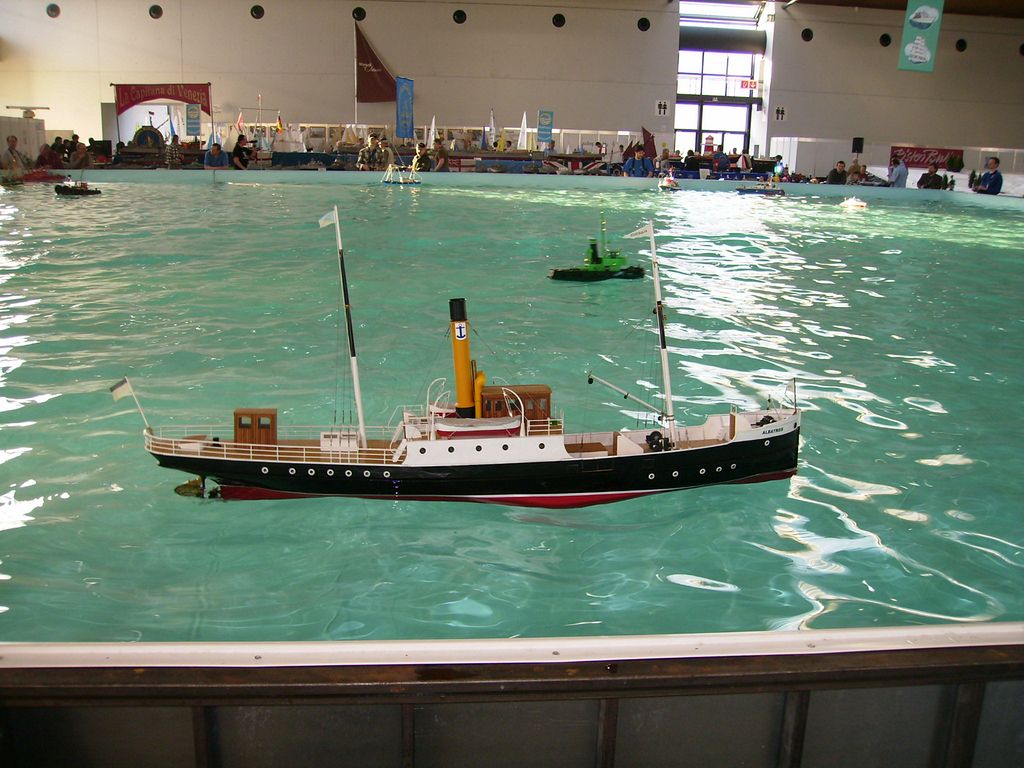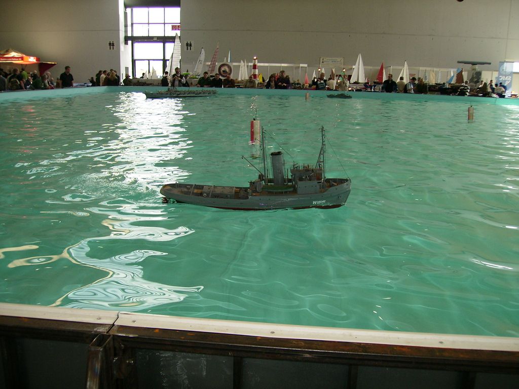 Nechci obtěžovat líčením okolností (je to drsné). Zkrátka jsem se nějak k tomu namotal a nedalo se uhnout, takže nakonec jsme s manželkou seděli za vystavovacím stolem, 2 až 3x denně popadli svoje lodě a drandili na obřím bazénu, a během dne jsem já nebo manželka tak 50x vystartoval k ventilu Parního Prkna a předváděl, že se strojky na něm opravdu točí. Cvičená opice by to nedokázala líp![]()