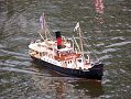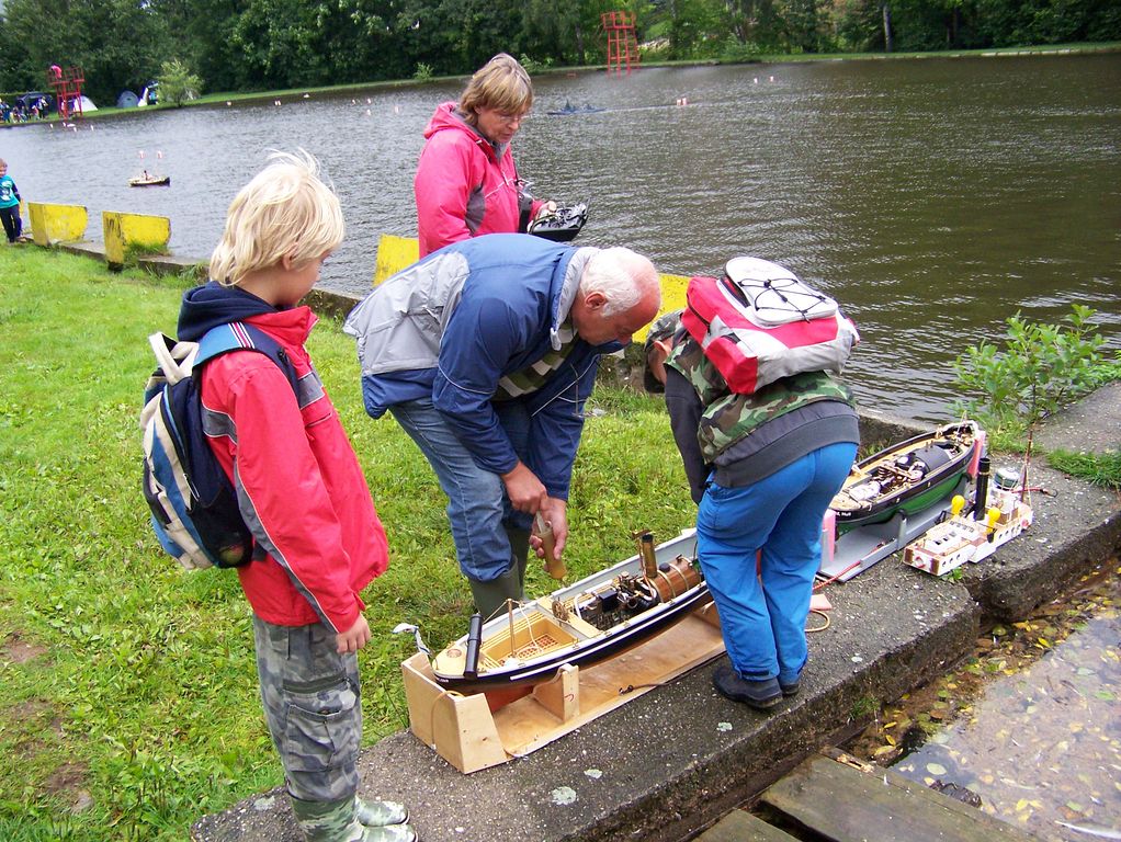 Na místo jsme přijeli kolem půl desáté, a byl to akorát čas, kdy na vodu šly parníky. Přiznám se, že jsem se těšil, protože parníky jsou moje srdcovka. Jaké však bylo moje zklamání, když jsem viděl, že na závodu se zúčastňují pouze tři modely. Útěchou mi bylo, že dva modely kormidlovali pan a paní Voráčkovi. Na jejich modely je pokaždé radost pohledět a musím uznat, že navzdory větru si vedly velmi dobře (tady si trošku šplhnu - paní Voráčková byla stejně lepší). Zatímco pára se předváděla na vodě, na břehu se začaly chystat bitevní lodě. Překvapivě byly také tři. Jestli se domluvili či co, mi není známo. Nutno říci, že tyto byly divácky vděčnější. Ne že by jejich jízdy byly natolik bravurní, či snad předváděly pyrotechnické efekty, to ne. Upoutaly spíše pobíhajícími kapitány po břehu, kteří se marně pokoušeli dostrkat radiové vlny anténou až k lodi. Holt spěch se nevyplácí a tady to platilo dvojnásob, stačí opomenout správně zapojit anténu, či ji nevytáhnout z vnitřku trupu a je na problém zaděláno. Ale i ony nakonec svou soutěž odjezdily.