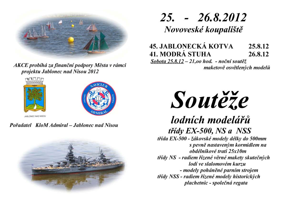 Rok se s rokem sešel a s ním přichází i pozvánka na tradiční jablonecké soutěže lodních modelářů, které se pravidelně konají koncem srpna již řadu let. Letošní 45. Jablonecká kotva proběhne v sobotu 25. srpna 2012 od 9:00 h, večer v 21:00 h budou následovat rovněž soutěžní noční jízdy a v neděli 26. srpna 2012 se můžeme těšit na 41. Modrou stuhu, jež vypukne v 8:00 h. Další podrobnosti naleznete v krátkém článku.