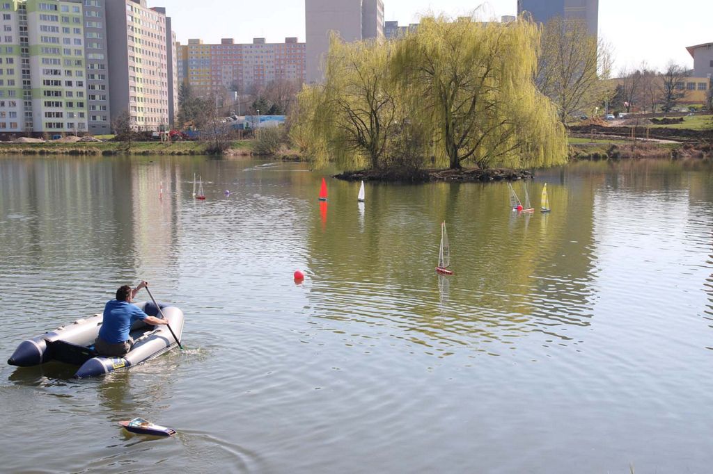 Nicméně soutěžní odpoledne začalo kategorií Footy, kdy se k mé maličkosti připojilo dalších 6 modelářů. Krátce po odstartování mi na rameno zaklepala reportérka regionální televize s dotazem, zda se mnou může natočit rozhovor. Může, ovšem musí deset minut počkat. Snad ve stresu z blížícího se mediálního výstupu jsem mezi jednotlivými jízdami ve snaze nezdržovat štáb zanedbal kontrolu vody v podpalubí, až se Footyna ve 2/3 třetí jízdy změnila v jednorázovou ponorku a nikdo ji nespatřil více. Nestihl jsem ani vytáhnout fotoaparát, natož vyslat zjara pořízený nafukovací svážecí člun![]()