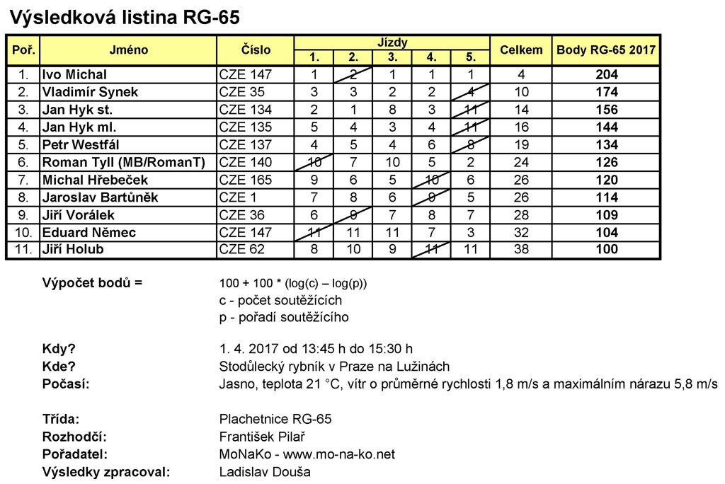 V sobotu 1. dubna 2017 jsme navázali na tradici a svolali ke Stodůleckému rybníku v Praze na Lužinách lodní modeláře, aby letos poprvé předvedli své modely. Jelikož jsme před rokem vypsali soutěžní seriál pro plachetnice třídy Footy, nemohl chybět ani tentokrát. Aby toho nebylo málo, vůbec poprvé došlo i na soutěž plachetnic RG-65.