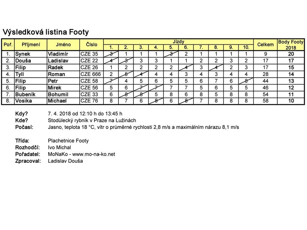 V pravé poledne se na vodu pozvolna vrhly plachetnice Footy, aby si dopřály 10 jízd úvodní soutěže z pětidílného seriálu Footy v Čechách 2018. Footyn sice soutěžně vyplulo jen 8 (žádná stavebnice), zároveň tato třída přilákala nejvzdálenějšího účastníka Michaela Vosiku ze Šumperska.