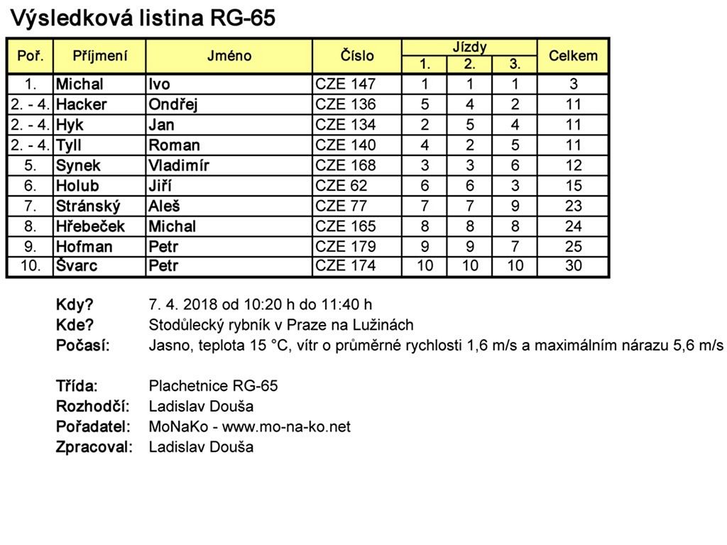 Nejprve se po vodě prohánělo 10 plachetnic RG-65, kdy po třech soutěžních jízdách s přehledem zvítězil Ivoš. Ovšem další pořadí bylo velmi těsné, neboť 2. až 4. místo muselo být dělené mezi Ondřeje Hackera, Jana Hyka a MB/RomanaT. Až na pátém místě najdeme první stavebnicový model, a to Dragon Force Vladimíra Synka. Nutno však dodat, že je oproti čistě stavebnicové verzi vylepšený.