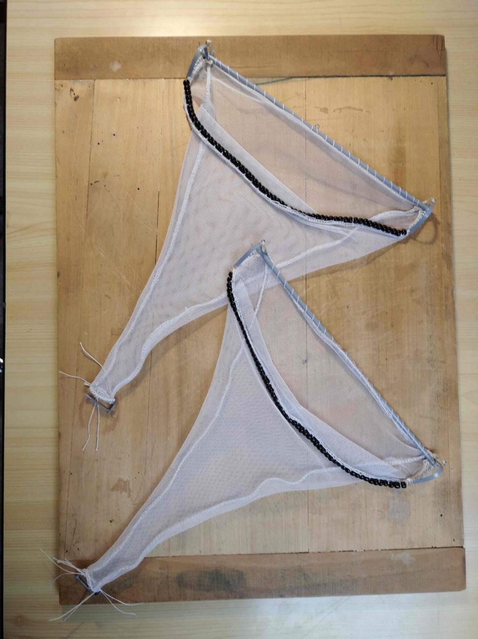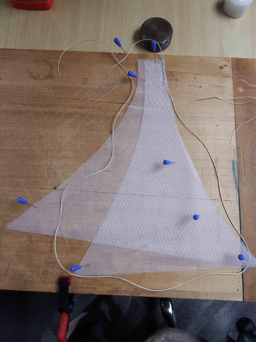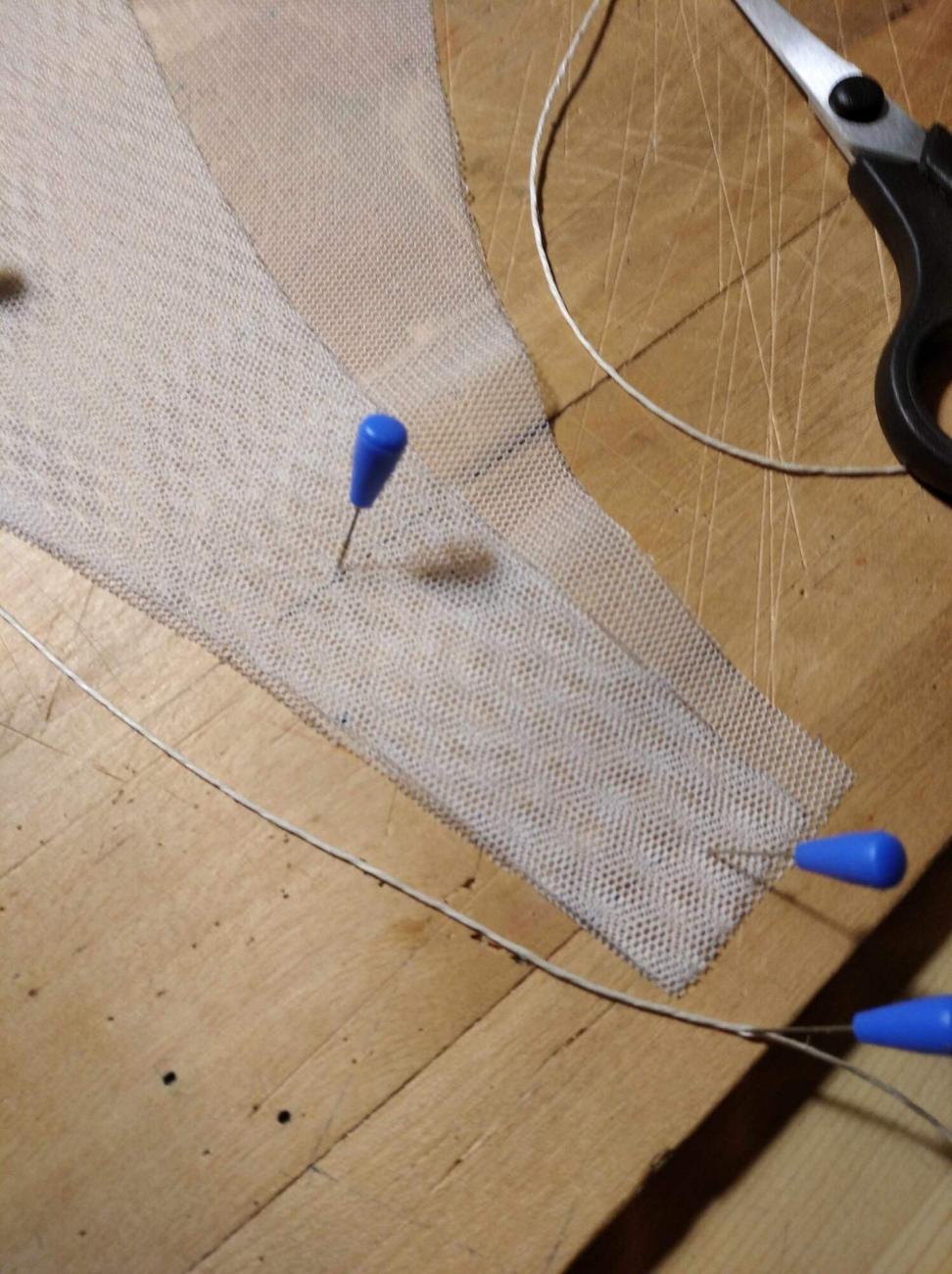 Z plánu jsem si zkopíroval šablony sítě na silnější karton a podle šablon z tylu vystříhal díly sítí. Na sešití jsem použil po obvodu sítě lněnou niť tloušťky 0,7 mm a vlastní šití je lněnou nití 0,3 mm. U role sítě (část jdoucí po dně moře) jsem nahradil dřevěné válečky ze stavebnice černými korálky z manželčiných zásob. Navlečeny jsou na řetízek ze stavebnice.