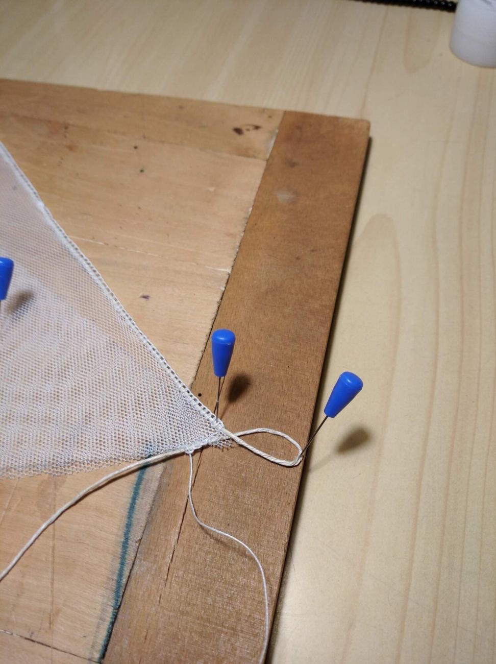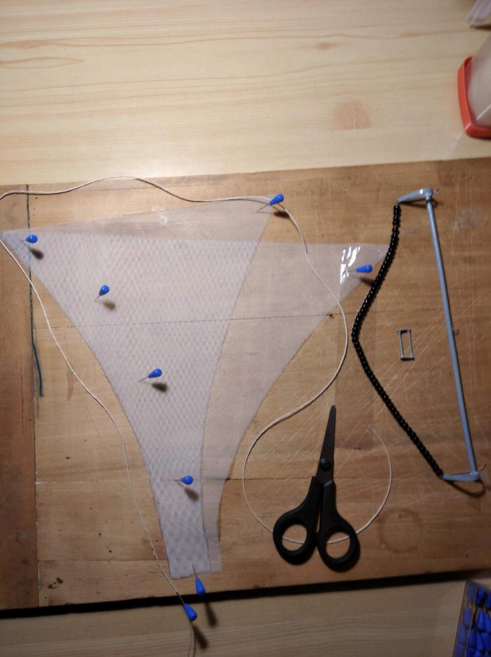 Co mne ale hodně nepotěšilo, byla dokumentace / plány ve stavebnici. V roce 1973 u první verze plány byly 1x A4, 2x A1 plus další sešity s popisem ke stavbě. Na těchto plánech jednak jsou přesně číslovány pozice lan a hlavně jsou tam šablony na rybářské sítě a nakreslen způsob jejich zhotovení. Ve verzi 2017 už byly plánky chudší. No a dokumentace pro Nordena je jen na A4, lanoví je jen zde nakresleno bez pozic a šablona na sítě chybí úplně. Inzerátem jsem se pokusil získat původní plány z roku 1973, to se mi podařilo. Když jsem si podle tohoto plánu vystřihl šablony sítí, zjistil jsem, že tkanina dodaná ve stavebnici Nordena je na tyto šablony malá. Tak jsem navštívil prodejnu galanterie a látek a koupil tyl s oky stejnými, jako měla látka ve stavebnici.