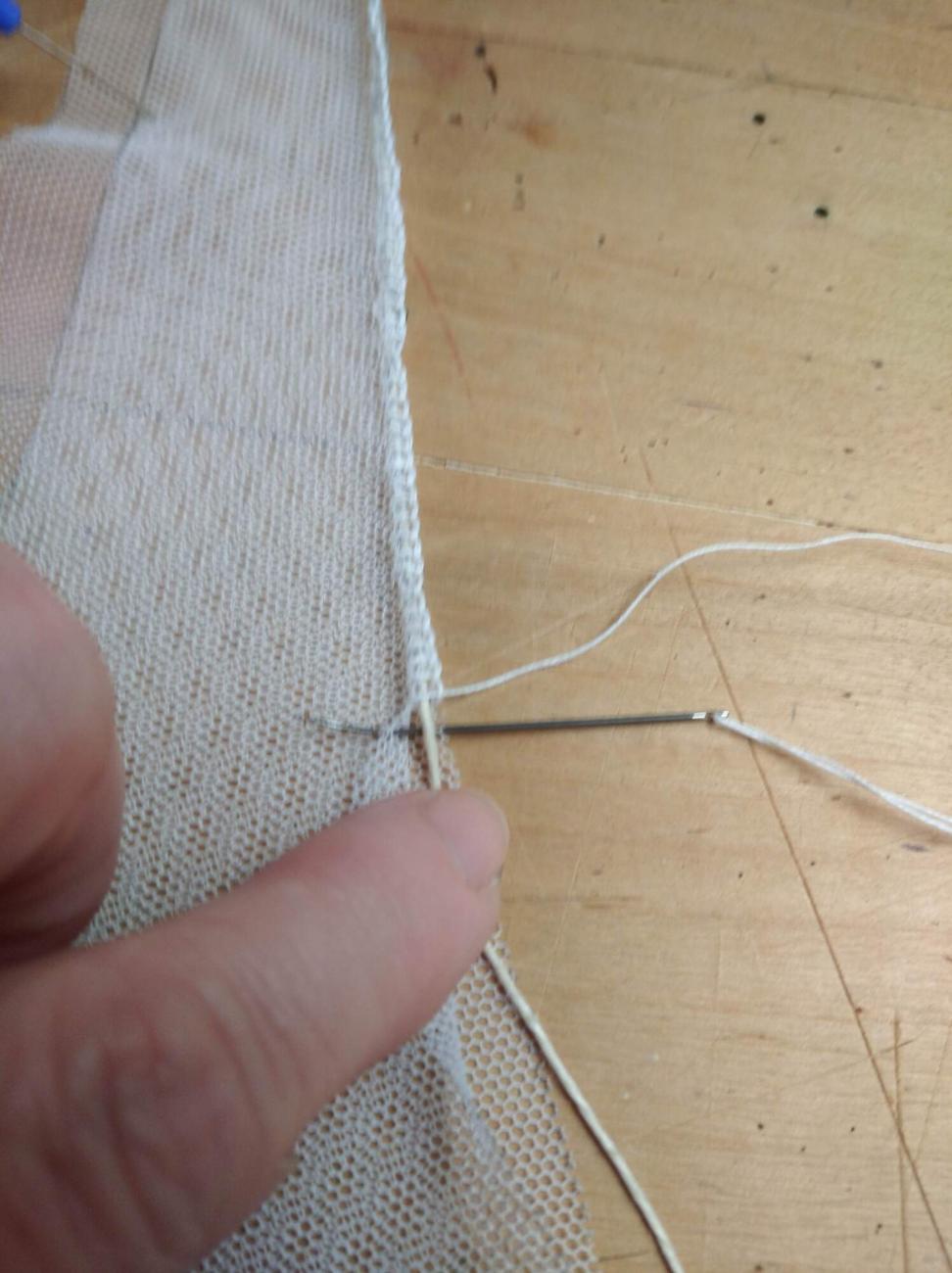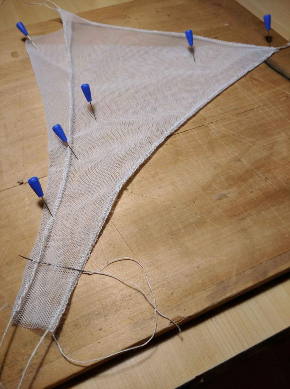 A proč jsem vlastně sítě sám nešil, ale ušila je moje manželka? První síť jsem sice ušil kompletní, ale bohužel jsem zvolil špatný postup. Lano po obvodu jsem totiž u lovícího otvoru sítě (u obručí ráhna nesoucí sítě) přišil k spodnímu dílu sítě, u druhé obruče se vrátil zpět a sešil zase oba díly sítě k sobě. Bohužel to byla slepá cesta, celá síť se mi kroutila. Nelíbilo se mi to a tak jsem svoje šití celé vypáral. Po poradě s manželkou jsme přišli, jak to asi má být správně – lemovací lano 0,7 mm musí jít jen po obvodu horní straně sítě. U lovného otvoru bude druhé lano jen kolem obručí a na lemu spodního dílu sítě. Manželka se šití nakonec ujala sama a za 3 večery byly obě sítě hotovy a přišity k obručím ráhen (omlouvám se, ale nenašel jsem přesné české názvosloví pro tato ráhna a obruče těchto sítí).