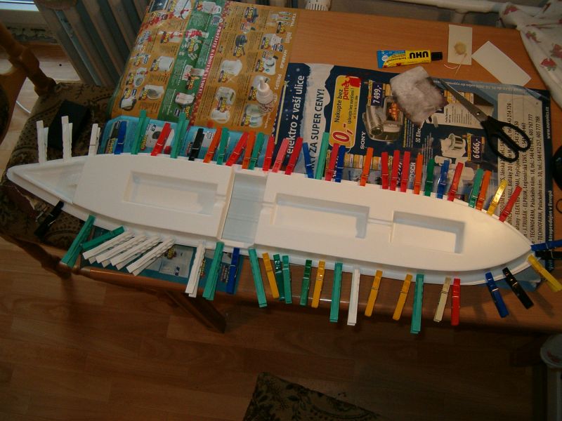 navlečena hliníková trubka. Z vyřezaných výlisků jsem použil strojovnu. Na palubě jsou čtyři lavičky. Nohy