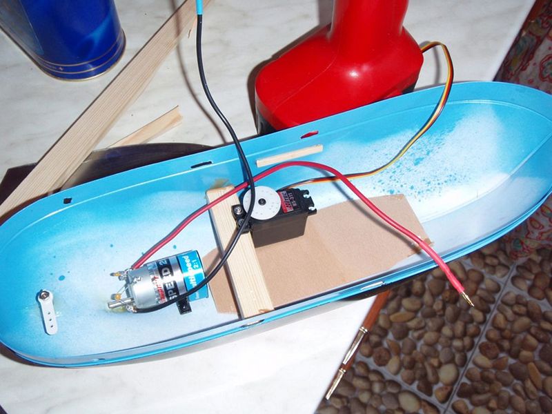 První věc byla, obstřihnout trup nůžkami podle návodu. Bylo to o pevné ruce. Pak jsem do trupu vyvrtal díru a zalepil hřídel epoxidovým lepidlem. Po vytvrdnutí jsem našrouboval šroub a skusil sílu motoru. Do trupu jsem zalepil dřevěný nosník na který jsem pak přišrouboval servo. Zvolil jsem Hs-311.