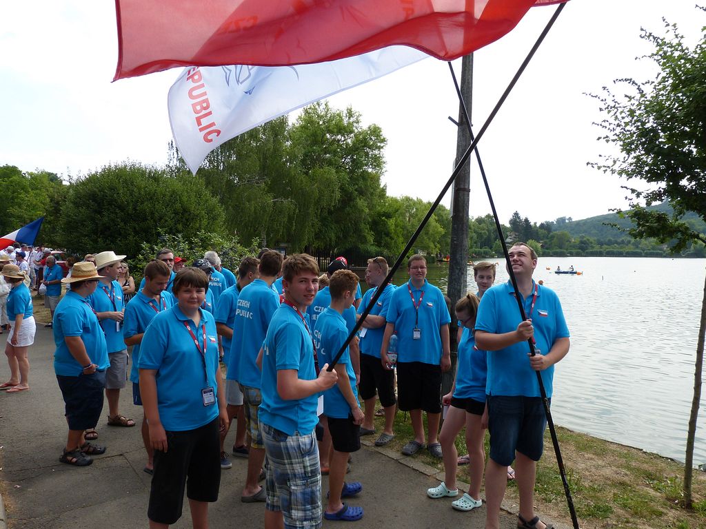 Okolo tři čtvrtě na deset se scházíme na parkovišti pro seřazení do průvodu, česká výprava patří spolu s Ruskem, Německem a Polskem mezi čtyři nejpočetnější. Vlastní zahajovací ceremoniál se koná v letním amfiteátru na břehu rybníka. Závodníci se rozmísťují do šikmého hlediště, kde sice není stín, ale alespoň si v cca 35° vedru můžeme sednout. Následují tradiční úkony včetně slibu rozhodčích a závodníků.