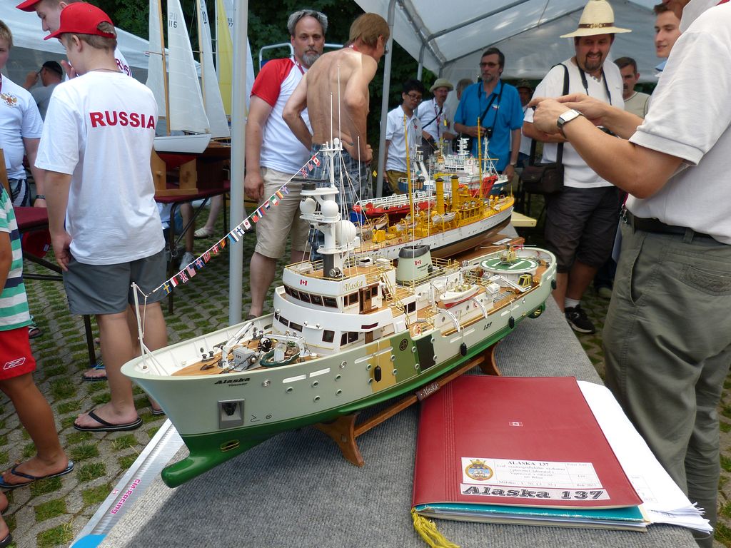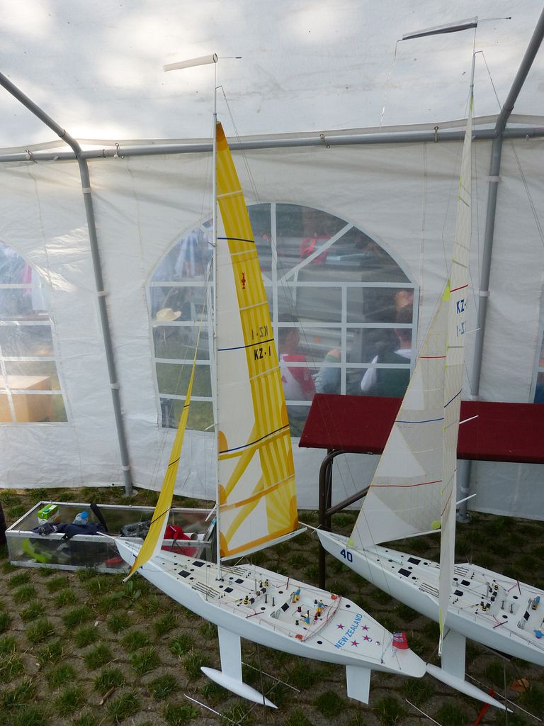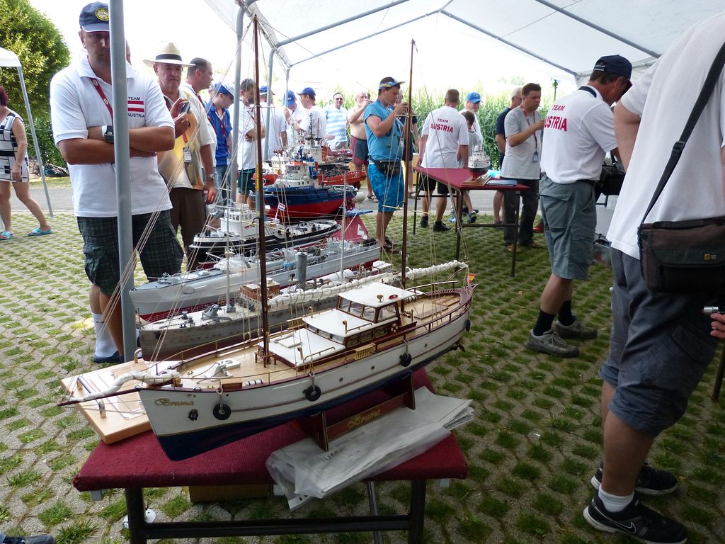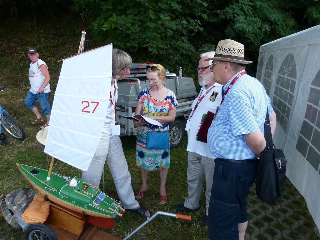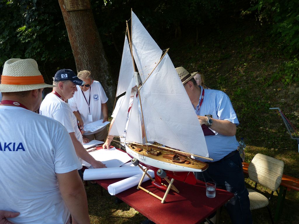 Ve vedlejším stanu začíná ve stejnou dobu bodování NSS-A, zde nejprve vzhledem k počtu lodí – 10 juniorů, 12 seniorů dochází k rozdělení na juniory a seniory, takže úplně první ze všech je na řadě Tomáš Jakeš s Amati (78,33b), obdrží několik připomínek ke sklonu špičky a výztuhám plachet. U plachetnic byl posuzován jen vzhled a shodnost s podklady na vážení a přeměřování plachet pokud jsem si všiml, nedošlo. K zajímavému prošetřování došlo hned po nástupu juniorů, u Rusky Raisy Basiny se objevily pochybnosti, zda je ještě juniorkou. Nakonec nepředložila nějaký osobní průkaz, ale Basin přinesl nějaké prohlášení na hlavičkovém papíru ruského svazu a Raisa byla juniorkou. Po plachetnicích NSS-A mělo na stejném místě od čtyř hodin začít bodování F4B seniorů. V tuto dobu rozhodčí NSS pomalu končili s juniory a ještě je čekali senioři, ale s plachetnicemi se stejně pod stan nevešli, takže nakonec bodování F4B nepřekáželi. NSS-A senioři, zde máme jednoho zástupce s velkou historickou plachetnicí Endeavour Milana Kroupu, která pak na vodě oproti modelům moderních rychlých plachetnic nemá moc šancí. Bohužel už ani poctivá „dřevěná“ modelařina nepůsobí na rozhodčí natolik, aby alespoň v hodnocení stavby přeskočily moderní plastové výtvory, takže získává jen 88b oproti 97,3b za moderní plastový New Zealand.