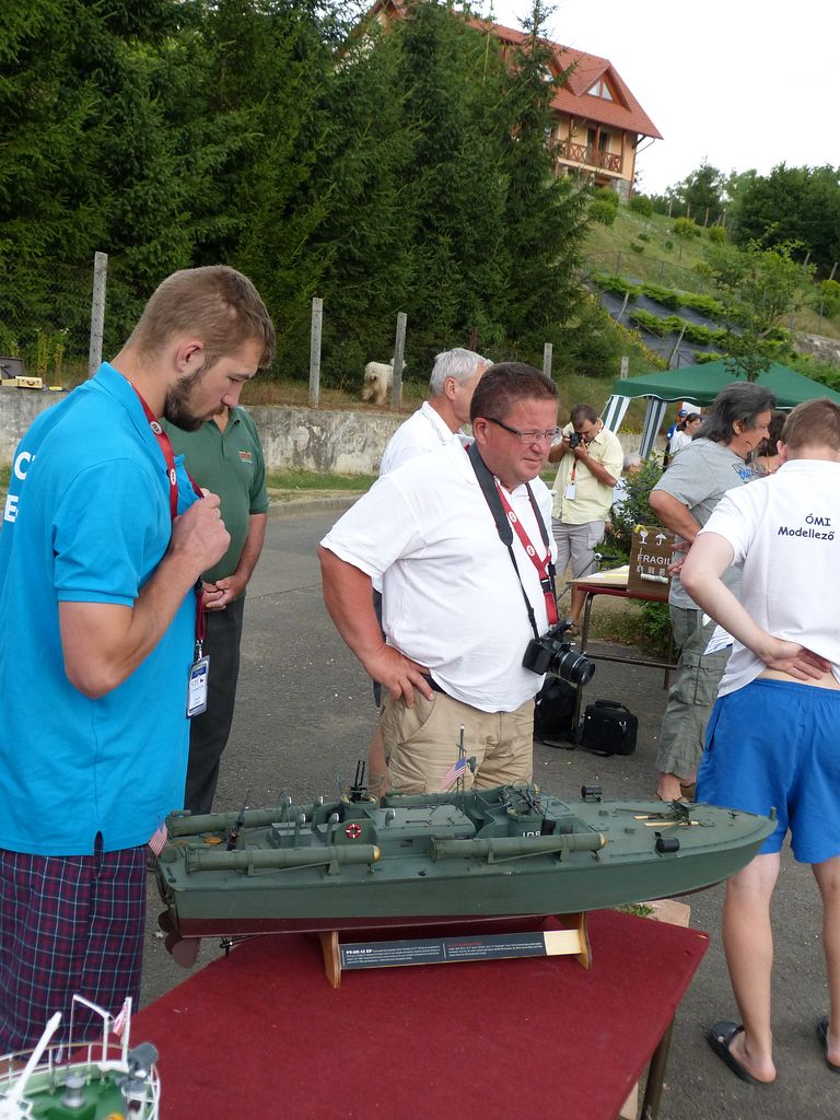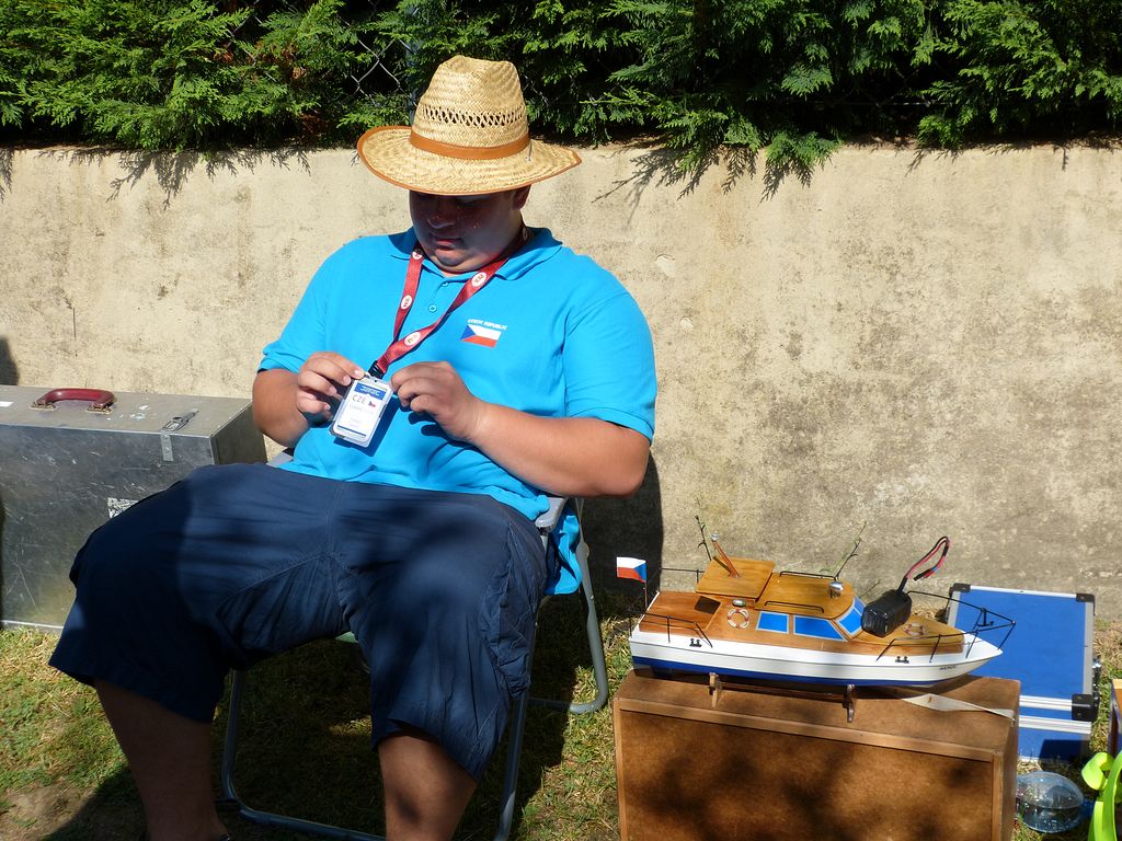 Příjezd do maďarského městečka Bánk, místa konání Mistrovství světa lodních modelů kategorie NS 2015. Na plánovanou schůzku ve 13:00 na parkovišti poblíž rybníka se závodišti se přeci jen všichni čeští závodníci nedostavili, takže cesta k registraci se odkládá na později. Podle zpráv z mobilů dorazí poslední s asi dvouhodinovým zpožděním. Naštěstí to nemá vliv na vstup již přítomných na trénink na závodní tratě. Toho využívají zejména naši závodníci z třídy F4A. Už při prvním pohledu na trať konstatují, že obě tratě jsou cca 13 m od břehu, tedy o 3 m dále než mají být. Jak jsem se později od maďarských pořadatelů dozvěděl, nepodařilo se jim je přitáhnout blíž, protože mají i přední stranu kotvenou ve vodě až na konci šikmého břehu, na kterém zátěže nedrží. Po získání posledních českých technických průkazů vyráží Láďa Douša na registraci. Vzhledem k tomu, že část modelů byla přihlášena v době, kdy ještě neexistovaly, jsou u řady modelů rozdíly v datech, a kupodivu i u letitých modelů, což ve výsledku znamená poplatek 90 Euro za opravy v technických údajích. Navečer, asi hodinu před koncem tréninku, se vydávám na vodu i já s Yorkshiremannem. Vzhledem k tomu, že se u vrcholové bójky plete plno malých modelů F4A jezdících podél spojnice bójí to po asi pěti průjezdech balím.