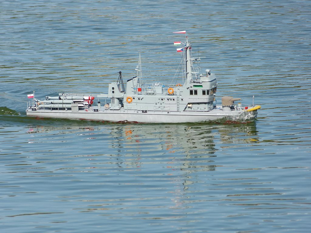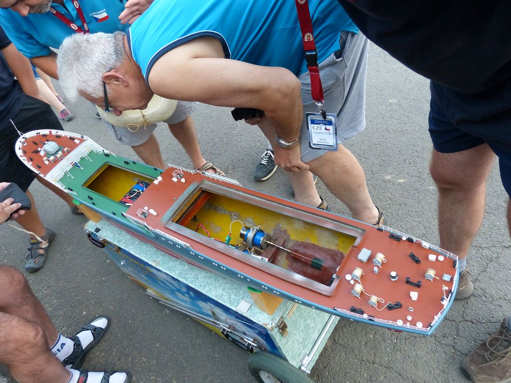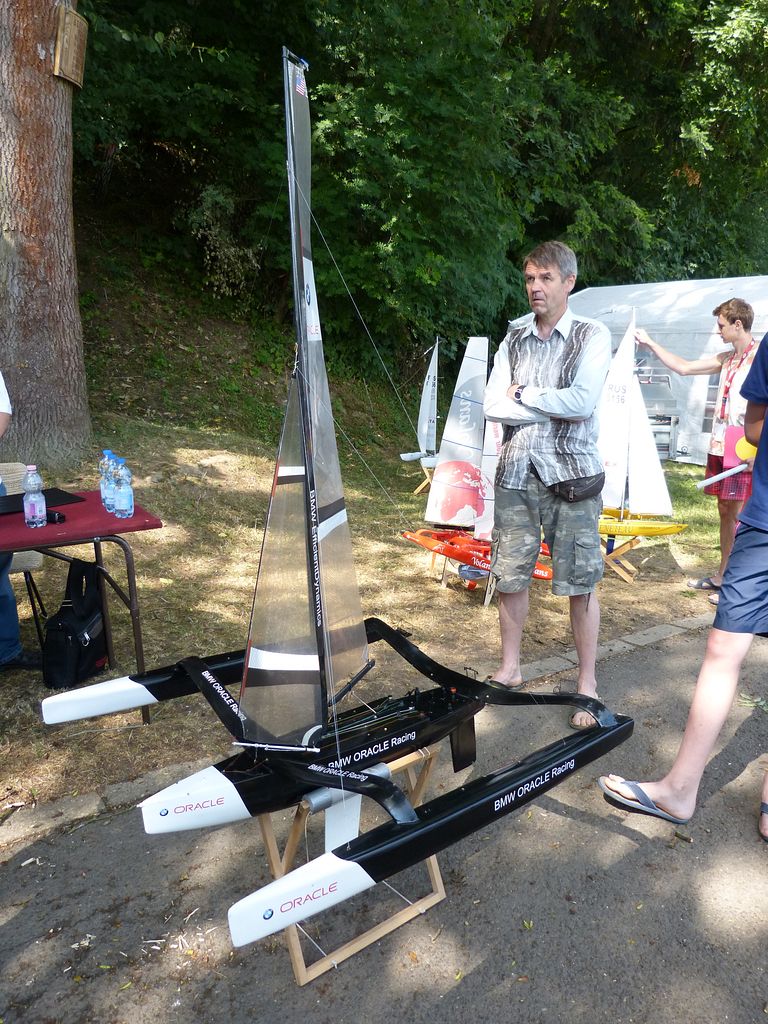 Díky výrazné změně počasí jsme nakonec nikdo z české výpravy nepostřehl ukázku nové třídy F2S – maketové funkční ponorky, která byla na startovišti F4 okolo půl páté, tedy v době, kdy od plachetnic již kdo mohl, utíkal domů. Takže z ukázky mám jen dvě fotky od Jeana Clauda a od Němce Angela Schapkeho jsem v pátek při čekání na bodování F4C získal informace o návrhu pravidel. Tedy pro případné zájemce: model funkční makety ponorky se statickým hodnocením, o zhodnocení „ponořovacího“ zařízení do základních 100b nebo samostatně jako parníky, nevím. Na vodě trať shodná jako F2, se stejným bodovým ohodnocením branek a kursem. Kurs po vjetí do trojúhelníku doplněn o ponor a vynoření (dohromady tedy 4x), je jedno zda statický, nebo dynamický s pomocí hloubkových kormidel, v rámci manévru však nesmí ponorka opustit trojúhelník, stanoven bude čas na ponoření a na vynoření, za jeho dodržení pak budou přidělovány body – 5b ponor, 10b vynoření. Dohromady za celou jízdu tedy 160b. Návrh v této podobě by měl být zveřejněn na stránkách Navigy v sekci NS k připomínkování.