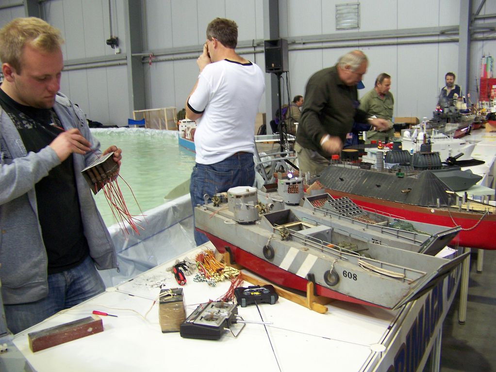 V pátek byl běžný pracovní den, a proto nás u bazénu mnoho nebylo. Navíc někteří využili příležitosti a jeli se podívat na Modell Hobby Spiel do Lipska. Kruhový bazén o průměru 15 metrů se tak stal jakýmsi mořem, kde se proháněly naráz průměrně tři lodní modely, což není mnoho. Pokud k tomu připočteme skutečnost, že jsme se o volné kanály po hodině dělili s automodeláři, pak náhodný návštěvník musel nabýt dojmu, že u bazénu chcípl pes. Jelikož se na společné prezentaci lodních modelů podílelo více klubů, tak jsme se k sobě navzájem pořádně ani nedostali a nějaké přeřvávání se přes celý bazén by nepadalo v úvahu.