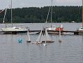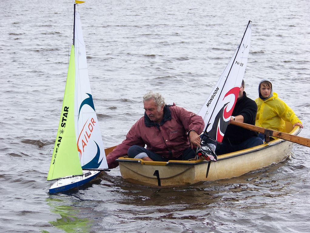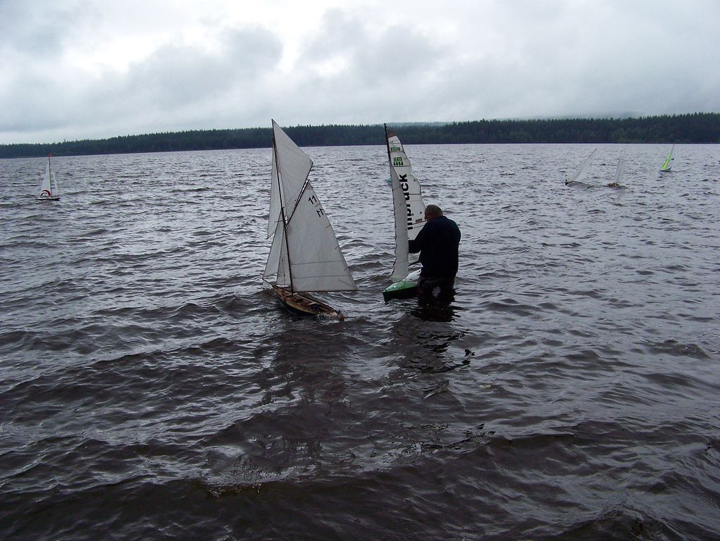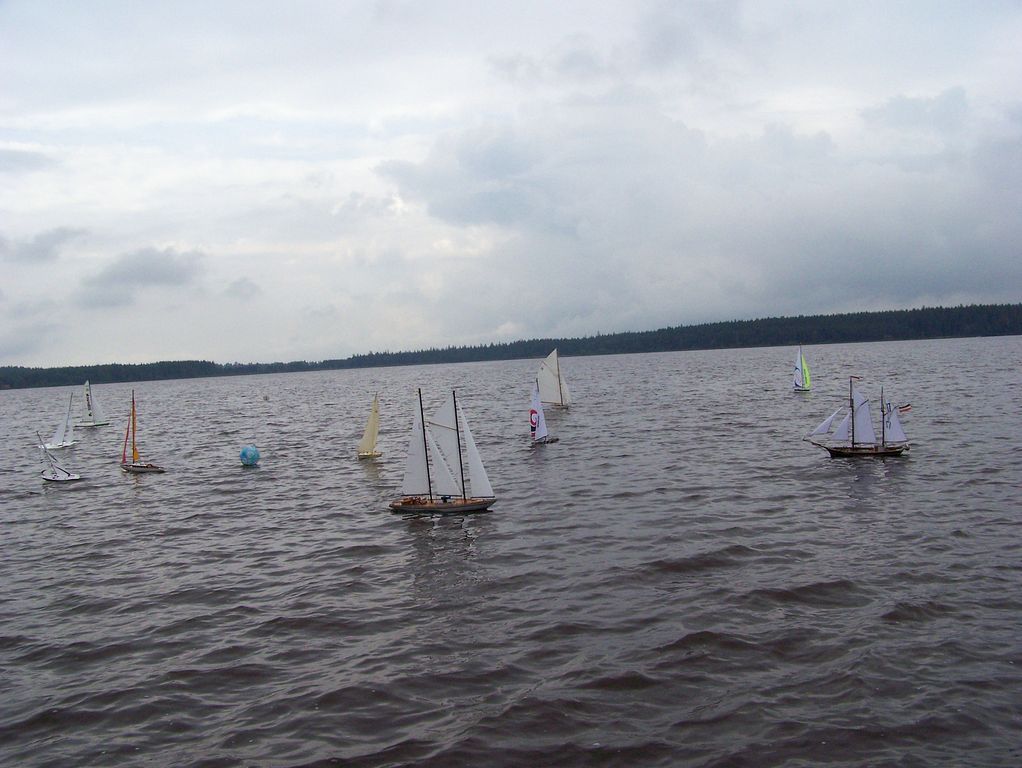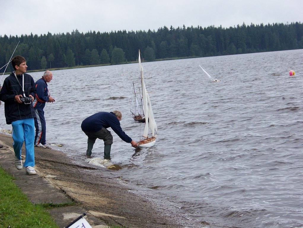 V mezičase, kdy ostatní seděli u sklenky něčeho dobrého, jsem stále vyléval vodu z KuM. Chvilku před druhou odpolední jízdou mezi nás zavítal neznámý modelář, aby se zeptal na námi používané kanály, jestli si může o kousek vedle pouštět plachetnici. Nekompromisně byl nahnán na hromadný start všech plachetnic, ač se mu příliš nechtělo.