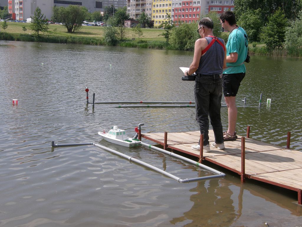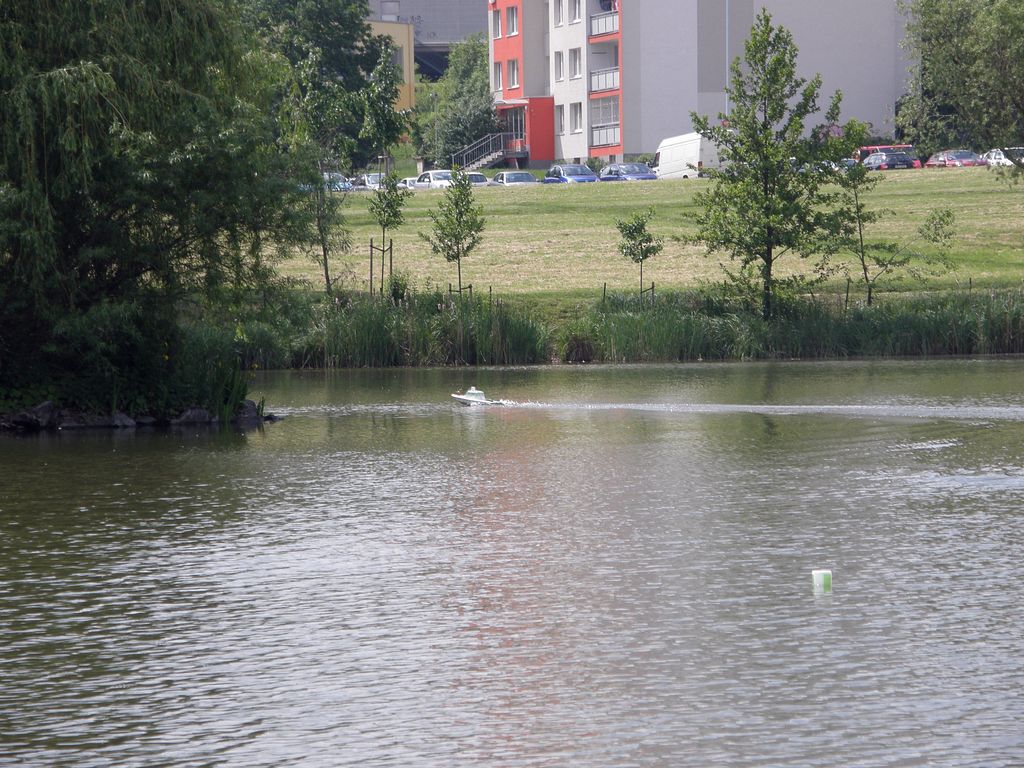 Druhou překážku pak představoval místní ostrov. Ač se všichni báli, že skrz vrbu na model neuvidí, problémy se dostavily dříve. Již samotné přiblížení k ostrovu pro některé majitele 2,4 GHz znamenalo stopku, neb model přišel o signál. Jen ti šťastnější museli řešit i tu eventualitu, že na model přes ostrov neuvidí. Pak se z hloučku přihlížejících ozývalo: „Jeď rovně... teď doleva... doprava. Už se musíš vidět.“![]()