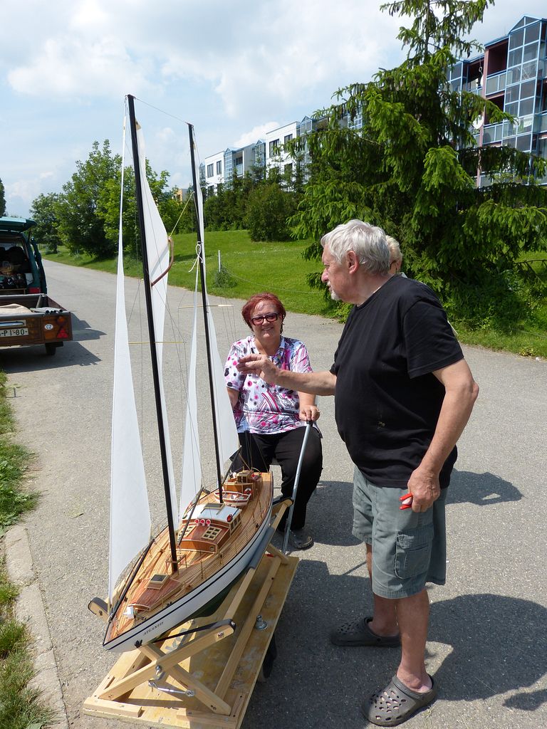 Hned při příjezdu se něco při přípravě škuneru k plavbě pokazilo, ale nářaďový kufřík a zručný syn se ukázali jako pečlivě připravené řešení.Zato moje osobní příprava ještě v suchém panelovém doku se ukázala tragicky nedostatečná, jelikož jsem málo dobil baterie.Za těchto okolností se můj škuner s jinak spolehlivým pomocným motorem zakrátko změnil na hladině v čistou plachetnici.A tak s ohledem na téměř nulový vítr se nám podařilo umístit ostudně škuner 2x do rákosového doku. (Tam z dostatečné vzdálenosti od porostu neodvratně a děsivě pomalu mířil až dosáhl svého. A po vyproštění a odstrčení na volnou vodu se tam znovu vrátil, jako by tam něco zapoměl...) Tolik moje zahanbující epizoda.