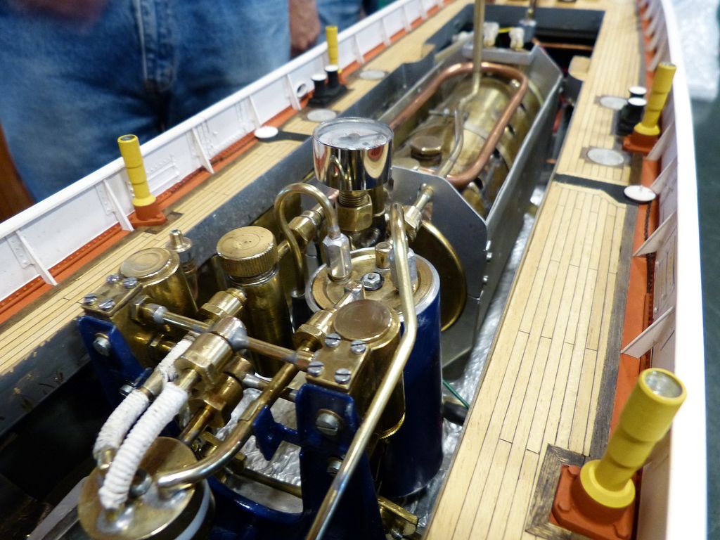 V sobotu jsme plachetnice vzali fofrem, a tak jsem mohl už v půl jedné okukovat snahy jiných maketářských ketegorií. To byl záměr, leč náhoda tomu chtěla, že jsem hned na první obchůzce narazil na nádhernou parní strojovnu, kterou přivezl Michal Šenekel z Desné (pokud jsem popletl jméno, tak se hluboce omlouvám). Strojařský skvost, který je zatím jen na prkně, podle majitele vznikal rok. Kdy se dočkáme zástavby do nějakého modelu, je zatím v nedohlednu, ale jednou to přijde. Toto parníkářské porno snad náležitě ocenili i ostatní maketáři, kteří cestou k vodě odkládali bedny s modely a šli pozorovat, proč se zde takový dav ohýbá až k zemi a fotí jako zběsilý. Kdyby bylo místo pro předvádění ve stínu, asi bych vydržel až do konce. Takto jsem po hodině a půl vzdálil opodál, zatímco Jiří Voráček nadále doloval rozumy.