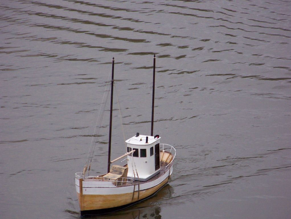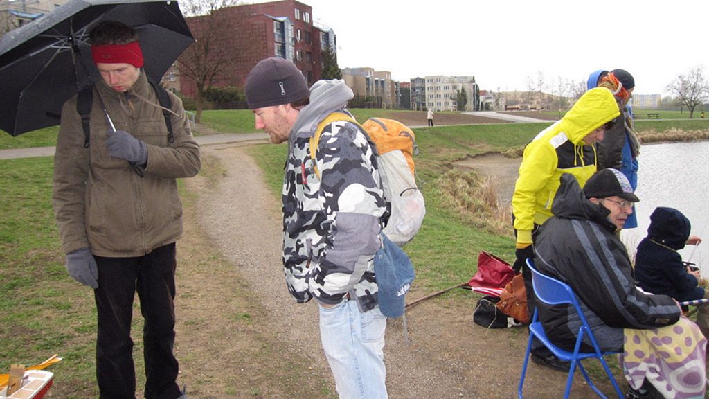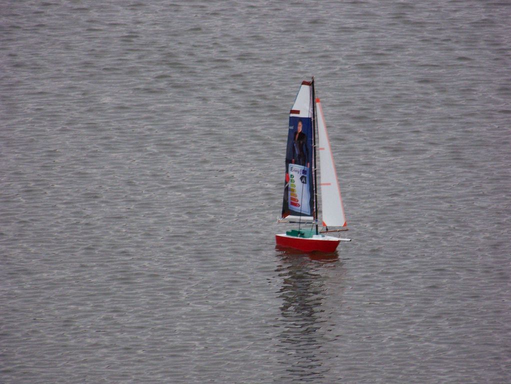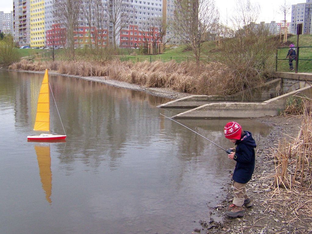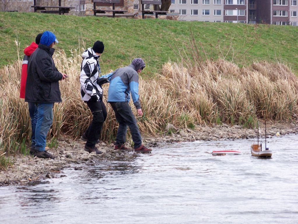 Po rychlém čaji jsem se ve chvíli, kdy déšť trochu ustal, navrátil k vodě, kde už Jindra Culek skládal plachetnici. Jakmile proces dokončil, přišly takové poryvy větru, až musel sundat kosatku. Nádrž byla po zimě ještě trochu upuštěná, a tak se dalo chodit po štěrkové pláži kolem rákosí a pohodlněji vyzdvihovat zatoulané modely. Absence záchranného plavidla se jednomu modelu stala téměř osudnou, nicméně naštěstí si to po převržení nenamířil rovnou ke dnu a bylo možné jej pracně dostrkat.