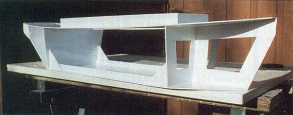38) Metodou „pokus - omyl“ vytvořte papírovou šablonu krytu kormidelního zařízení. Podle šablony kryt vyřízněte z polystyrenu. Na horní stranu přilepte 6 mm široké proužky polystyrenu s rozestupy 3 mm - jako napodobeninu dřevěných prken.