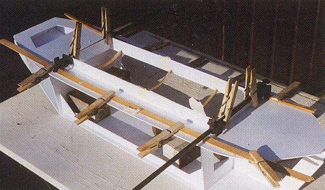 16) Pomocí kolíčků na prádlo přichyťte shora po obou stranách paluby dřevěnou lištu pro správné vytvarování sedlovitosti paluby.