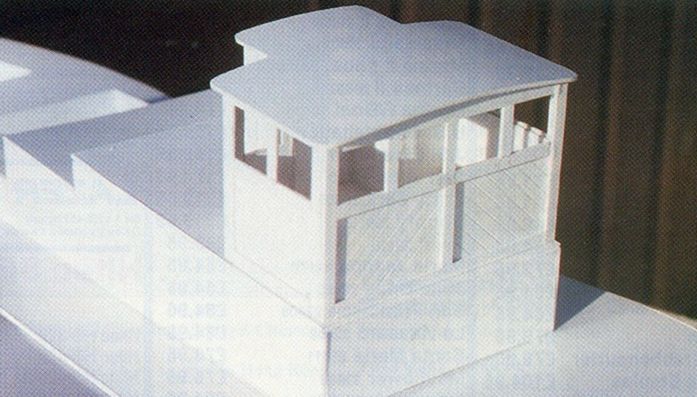 28) Uřízněte několik 6 mm širokých proužků polystyrenu a vytvořte z nich vnější orámování kormidelny. Orámováním jsou tvořeny i rámy oken. Vyřízněte díl nad přední okna s obloukem podle prohnutí střechy na horní straně a přilepte jej.