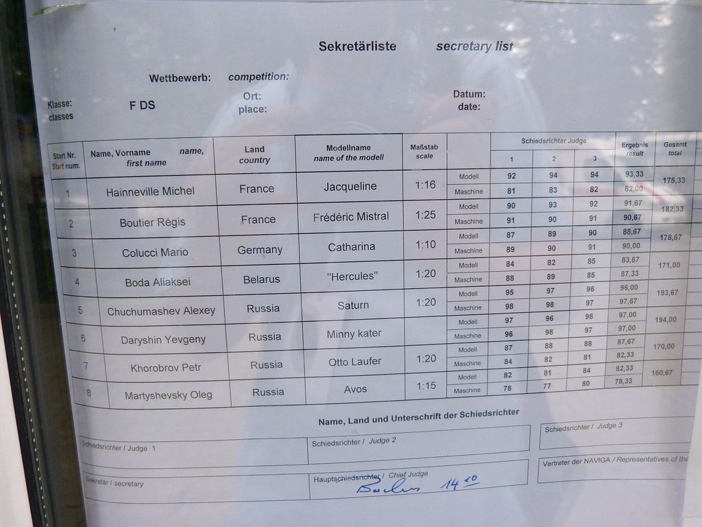 Německý modelář Mario Colucci se s rozhodčími chvíli hádal o to, zda strojovna jeho Cathariny (1:10) vznikla díky ruční práci, či nikoliv. To, že se strojek Stuart musí během sestavování různě opracovat, se za domácí výrobu považovat nedá. 88,67 bodů za model a 90 za strojovnu, tak zní konečný verdikt.