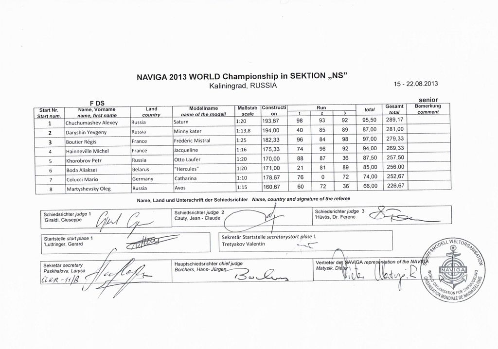 Yevgeny Daryshin z Ruska se může pochlubit největším statickým hodnocením za svůj parník Minny kater (1:13,8). Nad tím člověk skoro kroutí hlavou, když do opticky poloprázdného trupu nahlédne. Sice je zvolený strojek šoupátkový a leskne se spolu s kotlem jak psí kulky, ale jinak nic moc. Zato zvenčí vypadá model k světu. Verdikt 97 a 97 bodů tak po statickém hodnocení představuje náskok 0,33 bodů na druhého nejlepšího, což je zanedbatelné. To by se musel stát zázrak, aby byla i tato třetina bodu uplatněna...