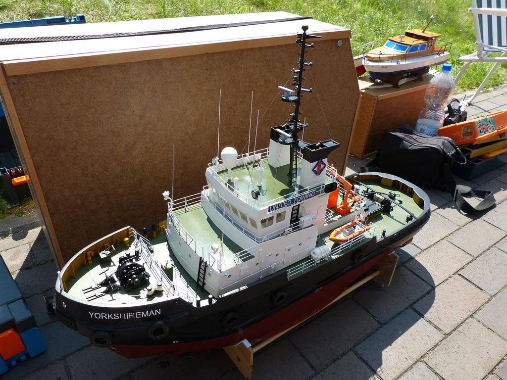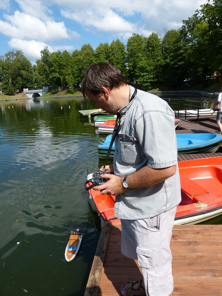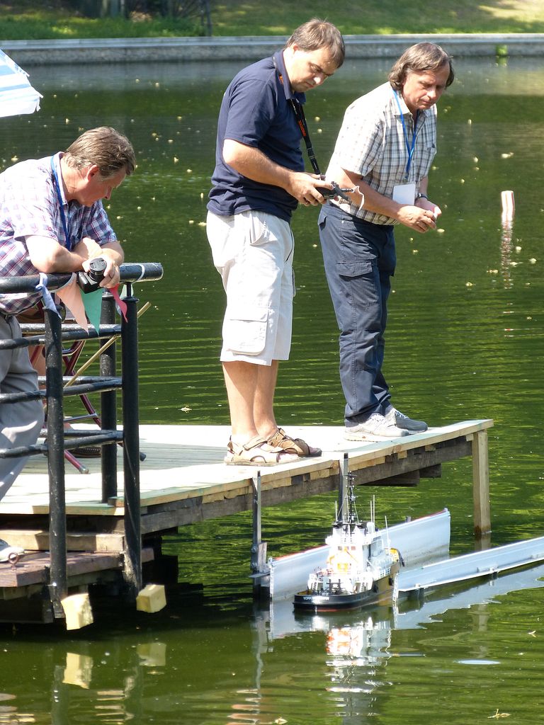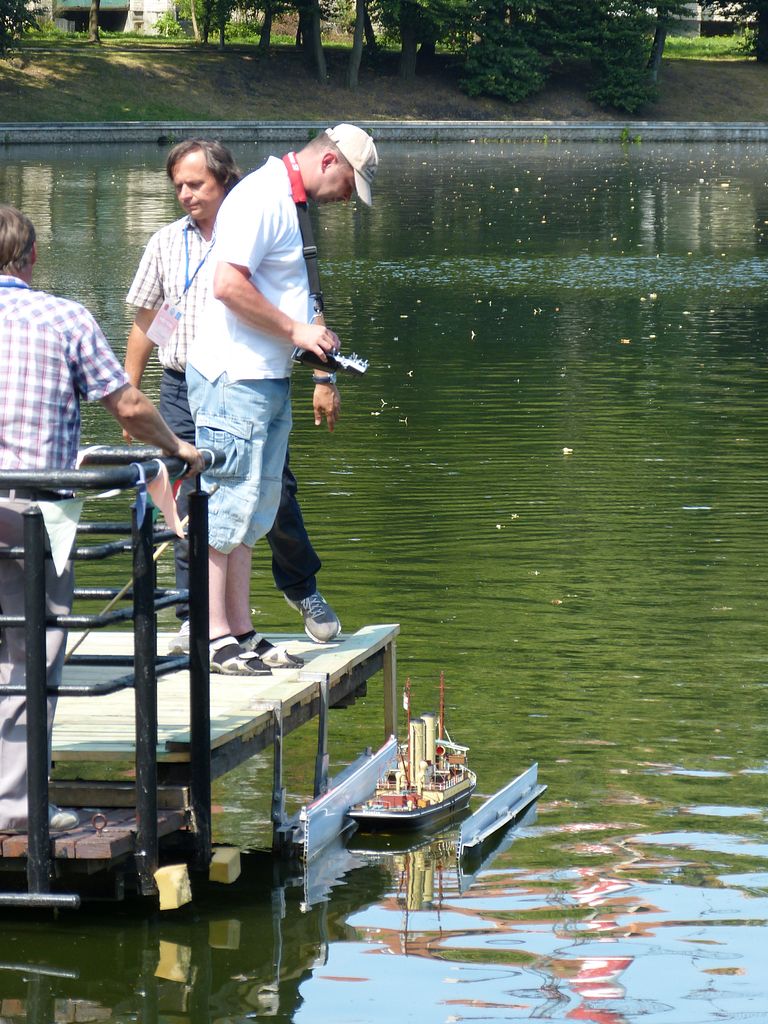 Start F4A proběhl dopoledne ještě před zahájením, junioři Tomáš 98 – dotek skluzem zadní bójky, Ondra 95 – nevýrazné zastavení v doku – pohyb lodě. Já v seniorech 92 – první dlouhá, druhá dotek zadní bójky. Takže ještě není ani zahájeno a my jsme někde na chvostu, jedině 98 Tomáše díky slabým výsledkům i ostatních zatím stačí na 2. až 6. místo. Po dojetí F4A začínáme shánět, kde bude bodování F4B, zatím nikde žádné informace nevisí, loňské místo je zcela prázdné. Jediné, co nás trochu uklidňuje, je, že zatím máme na kontrolou rozhodčí, ale ani ti nic neví, jen nás odkazují na velkou zděnou budovu v parku, tam v suterénu nacházíme pracoviště s počítačem – prázdné a místnost pro uskladnění lodí. Už je čtvrt hodiny po plánovaném začátku bodování F4B junior a stále nejsme na správném místě, pak nám někdo řekl, že to bude asi venku na druhé straně budovy. Za budovou je opravdu několik stolků a modelů. Chvíli po nás na toto místo docházejí i naši rozhodčí, stoly ještě blokují s F2A, takže ještě chvíli čekáme. Z juniorů jde první Tomáš, u Falkeho nacházejí jedny otočené dveře, chvíli je diskuze o poloze kotvy, bohužel z našeho mistrovství nemá zažitou diskuzi s rozhodčími, takže nedokáže prodat, co je na lodi jiného než díl ze stavebnice. Nakonec dostává 85,33 bodů. Po něm jdou na řadu tři Rusové s letitým Smit Russland (překreslený Smit Roterdamm) 87 b, policejní hlídkový člun Bremen a nakonec taky letitý se zvlněnou palubou Canute 91 b. Po juniorech je na řadě F4B senior, první je polský Yorkshireman, také už minimálně osmiletý, oproti dokumentaci ze stavebnice má dost detailů vlastních, ale některé vypadají hůře jak ze stavebnice. Oproti mně má v dokumentaci přiloženo asi 15 fotografií Yorkshiremana a pár sesterského Irishmana, který má jiné zbarvení, takže tyto rozdíly musí vysvětlovat. Také na jiných fotkách rozhodčí nacházejí drobné rozdíly – výška světlometů, poloha záchranných kruhů... Rozhodčí se trochu diví, že si bodování prohlížím dost z blízka, dojde jim to, když se podívají na následující loď ve startovní listině. Když nacházejí opět Yorkshiremana, požádají Poláka, aby loď nechal u nich na stole a já stavím okolo svou. Opět se vracejí k některým vytýkaným rozdílům a porovnávají je s mým provedením, u některých rozdílů argumentuji mými výkresy, kde požadované detaily nejsou. Při samostatném hodnocení podle mých výkresů mi nakonec nic nevytýkají, na vedoucího rozhodčích – Maďara – dostávám pochvalu za vyznačení svarů na palubě a jednolitý lesk (mat) na trupu (Polákovi vyčítali lesklé ponorové znaky). Nakonec Yorshiremany ohodnotili – polský 85,67, můj 90 b. Po mně jde na řadu Němec s remorkérem Resolve – 95 b, Maďar s moderním křižníkem z čínské stavebnice Kalinin – 96 b, pak už jen Rusové: rybářský kutr od Graupnera Elke 95,33 b (na MS 2013 87,3 b) a Bismarck 97,67 b.