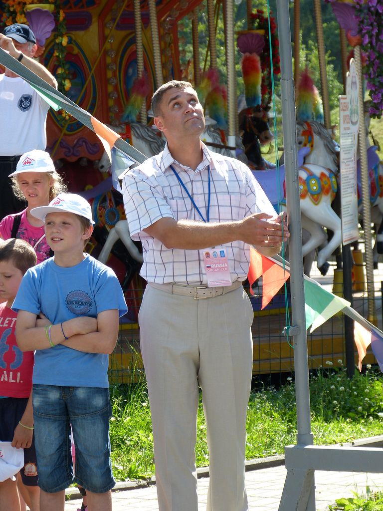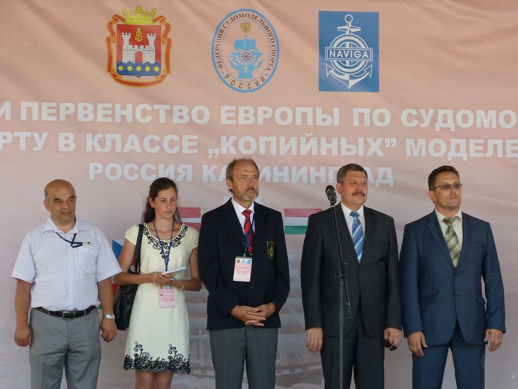 Uklízíme lodě, nakonec zpět do auta, protože to je výrazně blíž na startoviště než ze suterénní místnosti budovy se sekretářem závodů. Okolo tři čtvrtě na čtyři se pomalu houfujeme u pódia na slavnostní zahájení, je nám přidělena nosička státní jmenovky a vlajkonoš. Ve čtyři začíná za přítomnosti nejvyššího z Navigy – Matysika a guvernéra Kaliningradské oblasti a dalších zástupců ruských pořadatelů slavnostní zahájení, pár proslovů, kulturní vystoupení a vyvěšení vlajek – ruské a Navigy za znění hymen. Na slib rozhodčích a závodníků nedošlo. Při nástupu se dozvídám na plachetničkářů, že zatím vědí, že budou jezdit na vedlejší „velké“ vodě, se startem z protějšího břehu. Pro uskladnění lodí by měli mít poblíž k dispozici nějakou místnost – garáž v budově nějakého městského správního orgánu. K hlavnímu místu a startovišti F2, F4 to budou mít skoro 2 km.