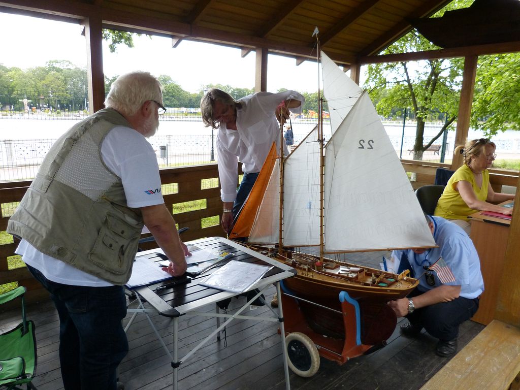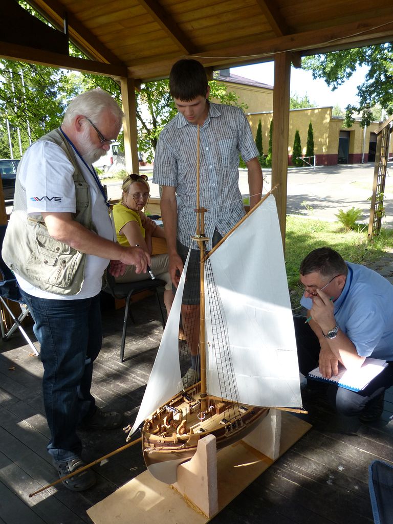 Jak již bylo napsáno v úvodním článku, plachetnicím patřila větší vodní plocha jezera Verhnee, přičemž startoviště bylo na druhém břehu. Díky příjemnému počasí mohla stavební zkouška ve středu 23. července probíhat pod širým nebem pod zahradním altánem. Bodovací komisi vedl Alexander Bogdanov. Dalšími členy byli Michal Daranowski a Ladislav Hanuška. Angličtina mohla jít tentokrát zcela stranou.