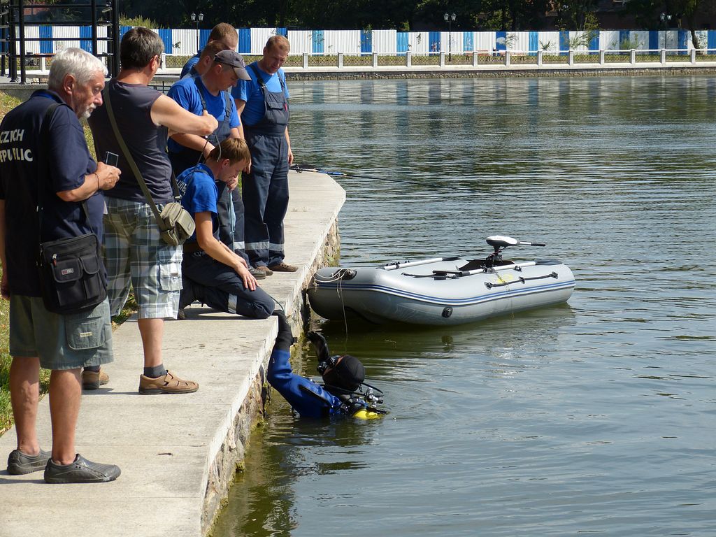 Voda byla sice celkem čistá, ale model klesl hlouběji než stačila metrová viditelnost. Úplné utopení plachetnice jsem nepředpokládal, proto neměla ani žádný signální plováček. Na palubě svážecího člunu též nebylo nic, čím by se dalo místo ztroskotání označit, proto pokusy o hledání pomocí ohnutého drátu na čtyřmetrovém laně nikam nevedly. (Možná jsem o ní zavadil a přetrhl otěž.) Tím spíše, když svážecí člun musel co chvíli uhýbat projíždějícím modelům.