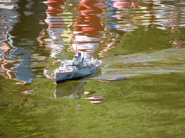 Z celé sobotní parády zbyly 4 neplovoucí modely a stejný počet postávajících členů (kteří ukazovali, jak se má správně čekat při nabíjení akumulátorů, poněvadž na show se nosí jen jeden), nepočítám-li tu plachetnici, která to statečně zachraňovala.