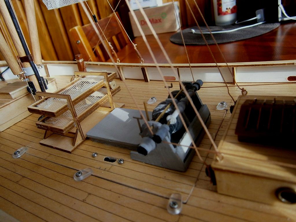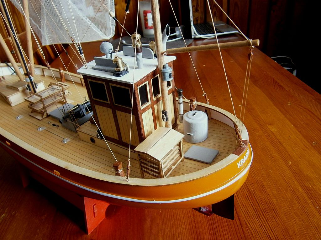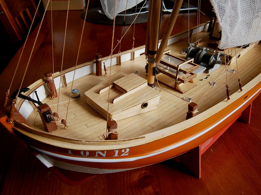 Po zaschnutí a vytvrdnutí barvy jsem palubu a trup spojil v jeden celek. Práce vyžaduje opatrnost a pečlivost, trup je v horní části měkký a paluba po nalakování trochu tvrdší. Při násilné manipulaci hrozí rozlomení paluby nebo prasknutí trupu. Postupoval jsem zpředu nasunutím výřezu a postupně jsem zasouval palubu do drážky v trupu. Pro správný tvar sítí jsem si před jejich vystřihnutím nakreslil papírovou šablonu. Ušité sítě jsem na několika místech zafixoval vteřinovým lepidlem. Nakonec jsem nalepil na zadní část paluby kamna, sušičku a kolem paluby 7 kusů úchytů. Stěžně a lana jsem dohotovil až na sestaveném modelu.